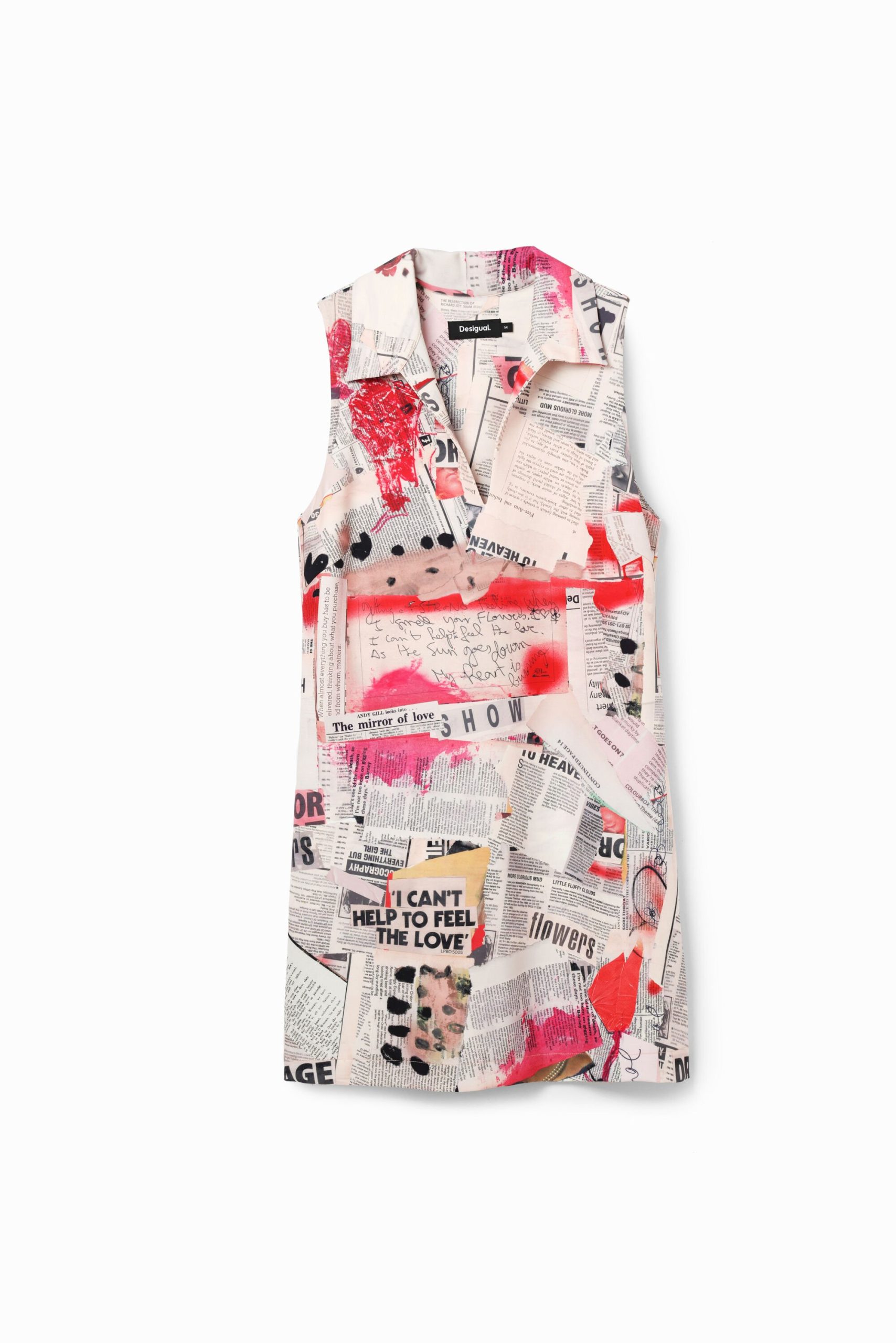 Korte mouwloze jurk met polokraag, achternaad, stretchstof en krantenprint.
