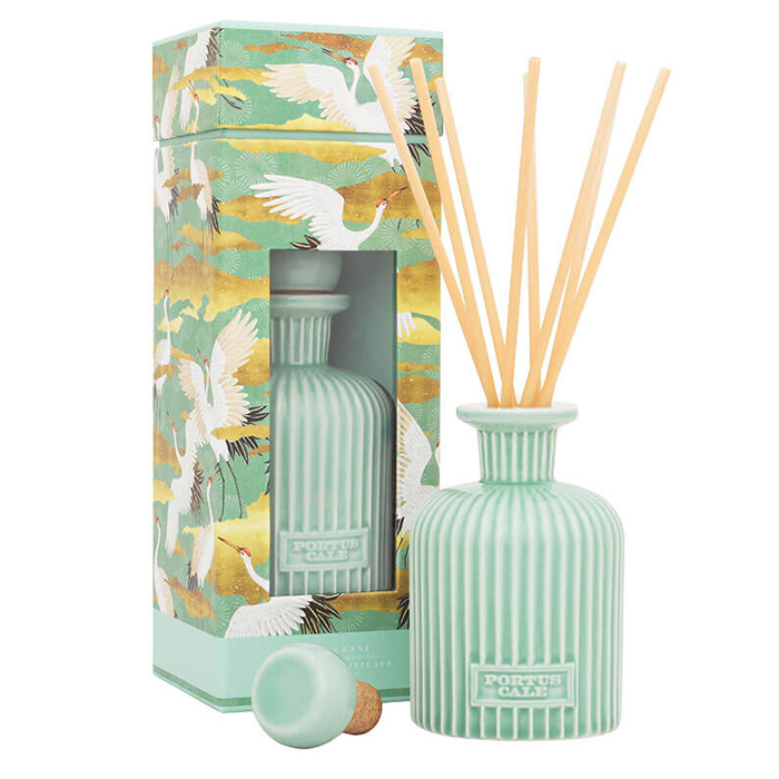Luxe geurdiffuser uit de Portus Cale topcollectie van het Portugese merk Castelbel. De White Crane lijn is geïnspireerd op de Aziatische esthetiek en legt de nadruk op gezelligheid, eenvoud en rust. White Crane is elegant geparfumeerd met een delicate geurmix van yuzu, vetiver en mandarijn. Voor een optimale geurbeleving raden wij aan de Portus Cale White Crane geurstokjes iedere 4-5 dagen om te draaien.De zeegroene keramische 250 ml diffuser heeft een elegant geribbeld effect dat doet denken aan de stilte en charme van een bamboebos. Iedere diffuser is individueel gemaakt en geretoucheerd door meester-keramisten met behulp van traditionele methoden en technieken. Dit resulteert in unieke stukken, met subtiele variaties in kleur, vorm en andere kleine details, waardoor ze stuk voor stuk net zo uniek zijn als de persoon die de diffuser ontvangt. De White Crane geurdiffuser zit verpakt in een stijlvolle cadeaudoos met goudfolie accenten die rijkelijk versierd is met witte kraanvogels.
