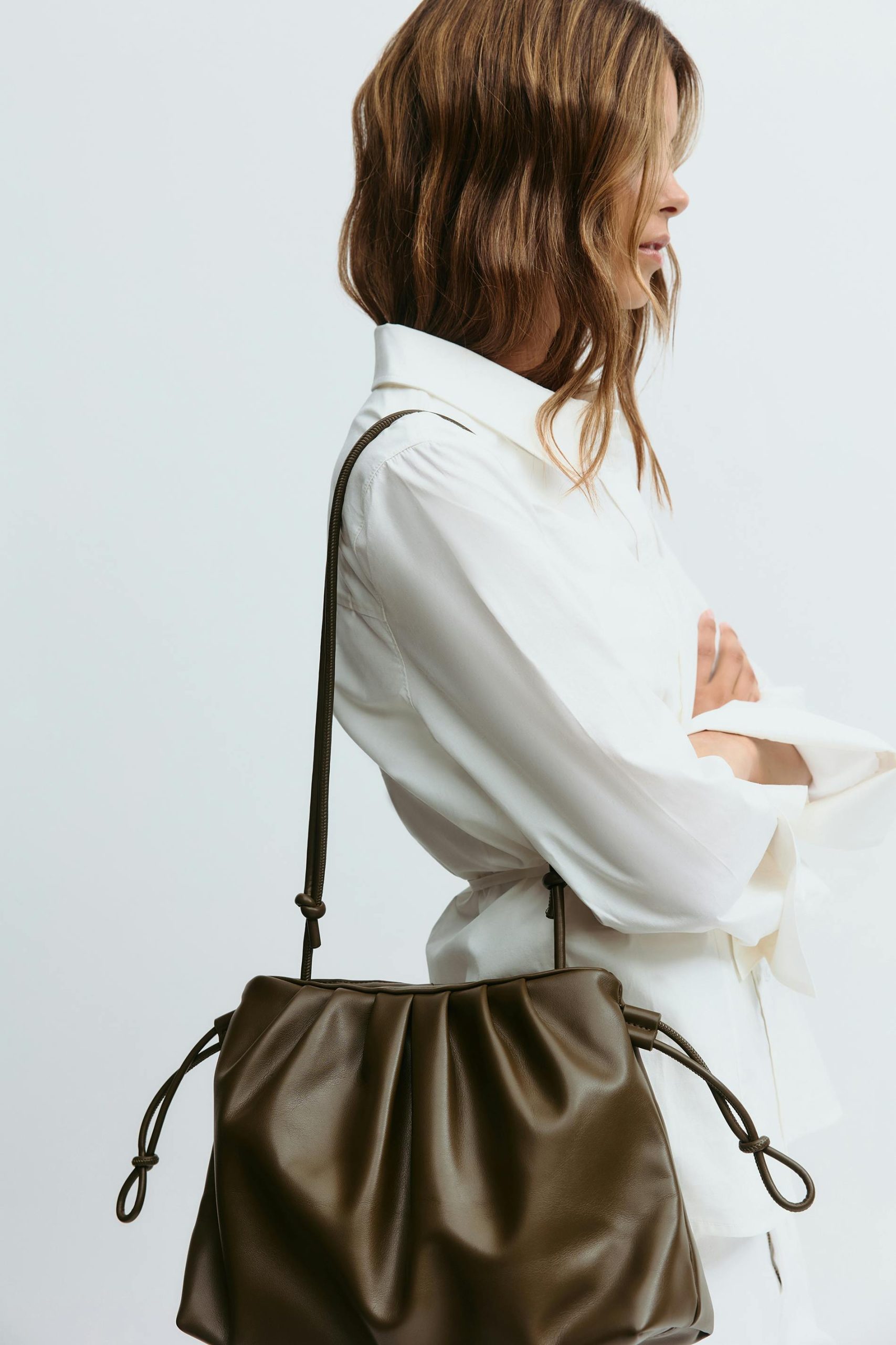 Tas met gerimpeld ontwerp. De tas is bruin en heeft lange en verstelbare schouderriem. Het heeft een magnetische sluiting, gevoerde binnenkant en aanpasbare trekkoorden in de zijden.
