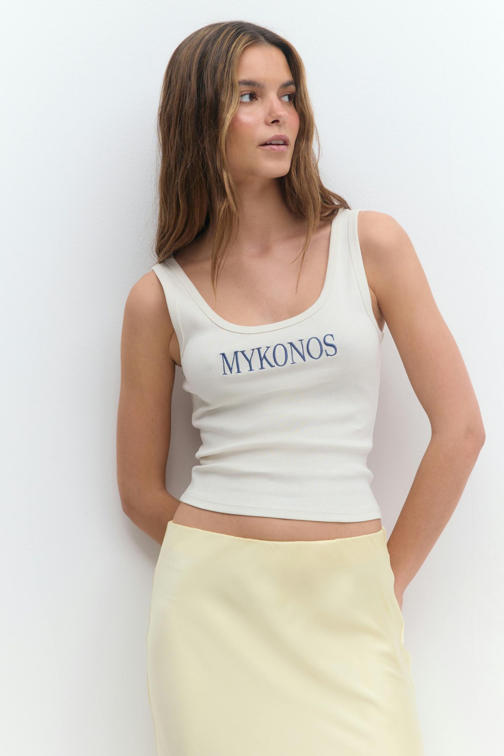 Afgesneden tank met geborduurde tekst aan de voorkant. De tank is wit en heeft een nauwsluitende pasvorm. Print: Mykonos.