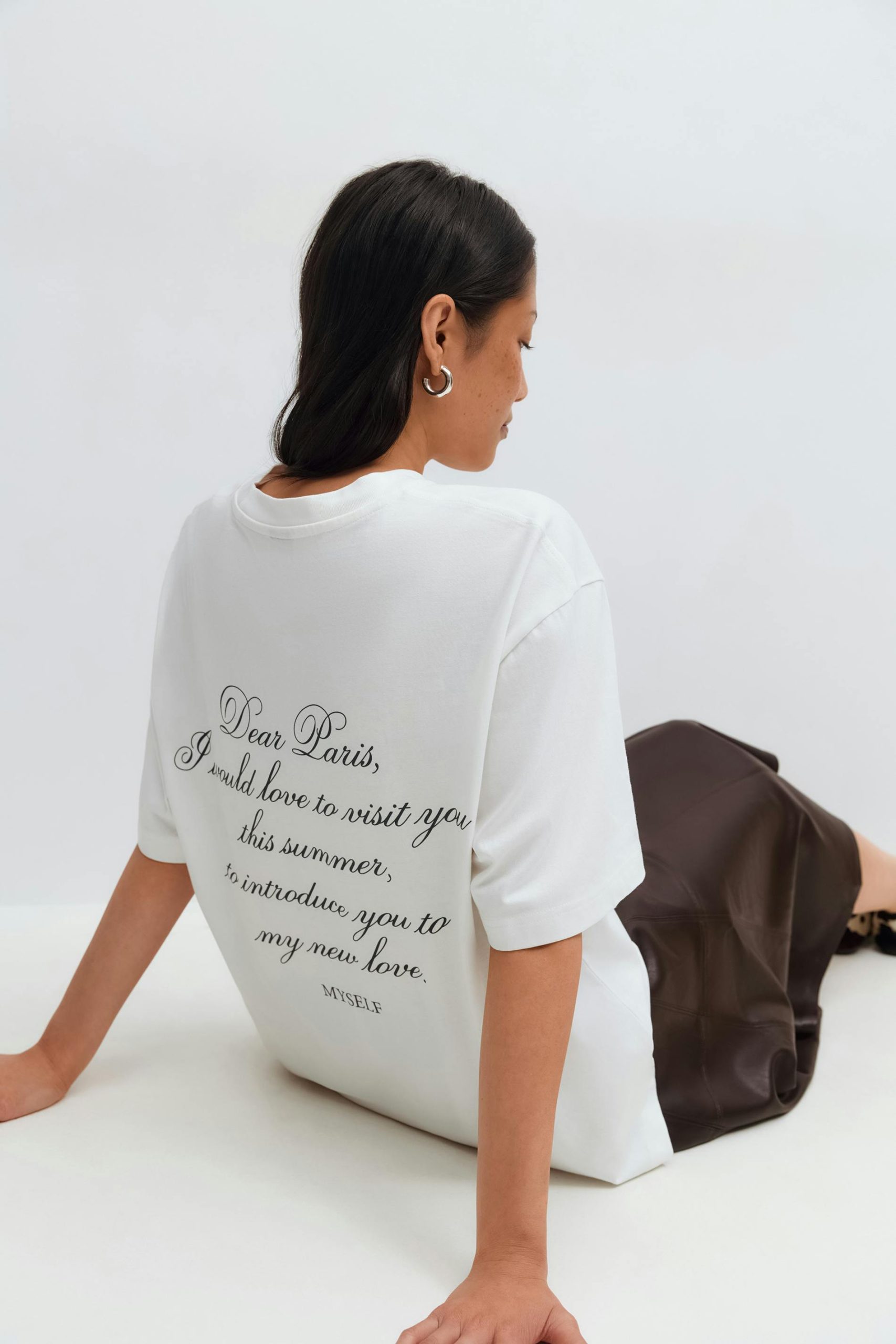Oversized t-shirt van katoen met print op het achterpand en op de borst. Het t-shirt is wit en heeft korte mouw. Het heeft ronde halslijn met ribbels. Print: Dinner in Paris.