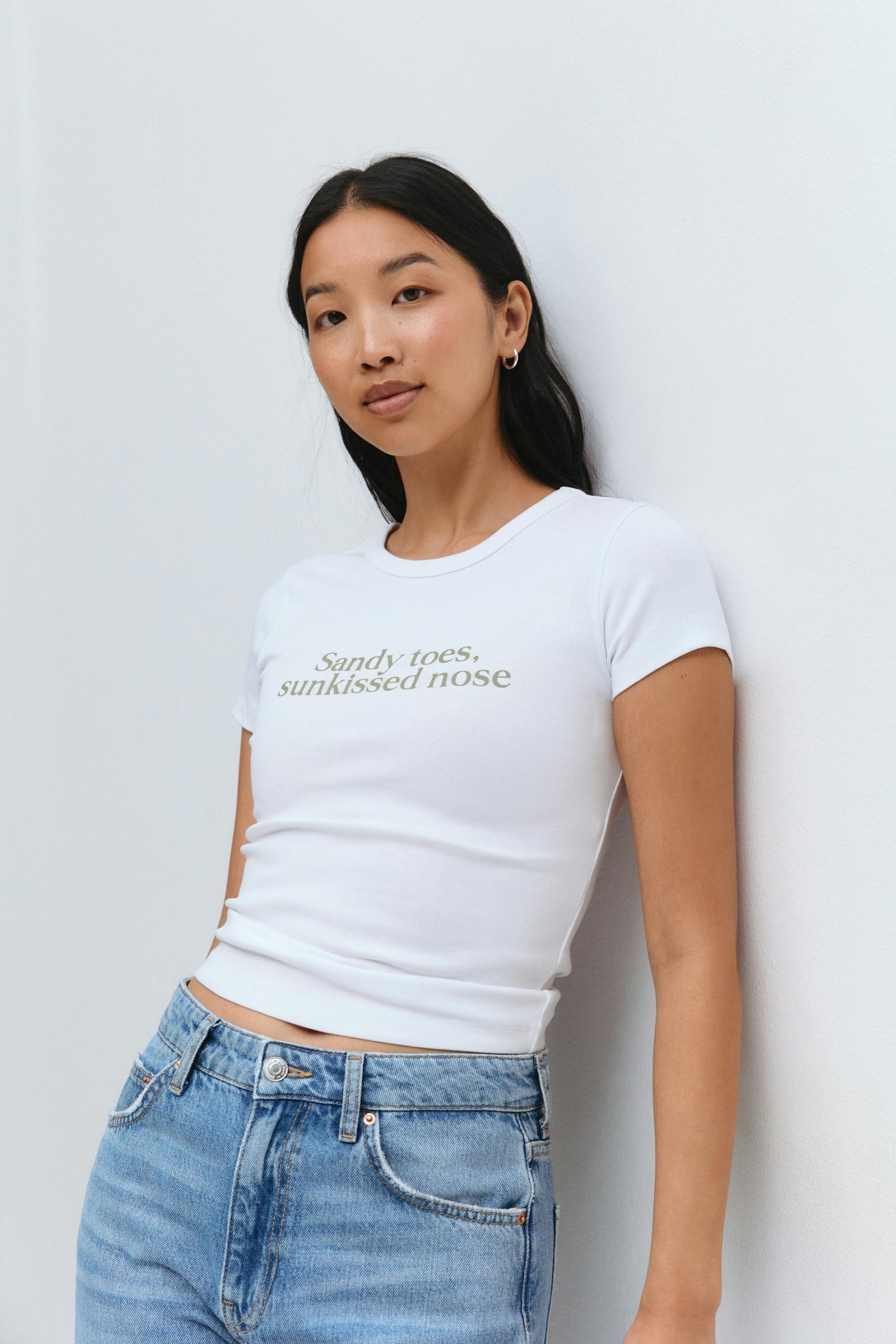 Bovenstuk met korte mouwen met print aan de voorkant. Het topje is wit en heeft nauwsluitende pasvorm. Het heeft ronde halslijn en afgesneden lengte.