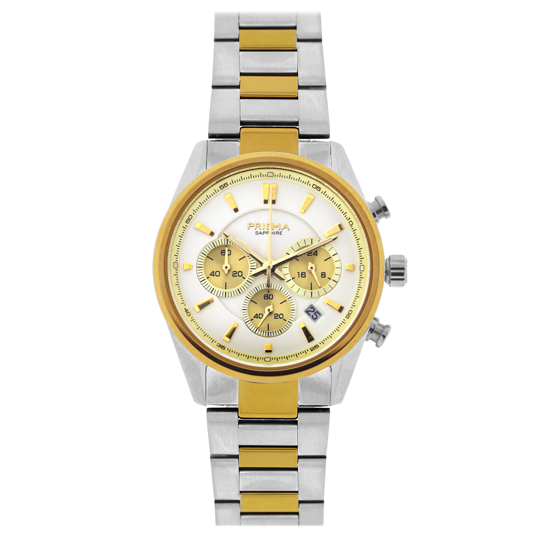 Het Prisma dameshorloge met referentie P.2066 heeft een roomwitte wijzerplaat en zilvergouden kast. Op het horloge zit een zogeheten chronograaf functie. Met de twee drukknoppen aan de zijkant van de kast kun je de timer starten en resetten.