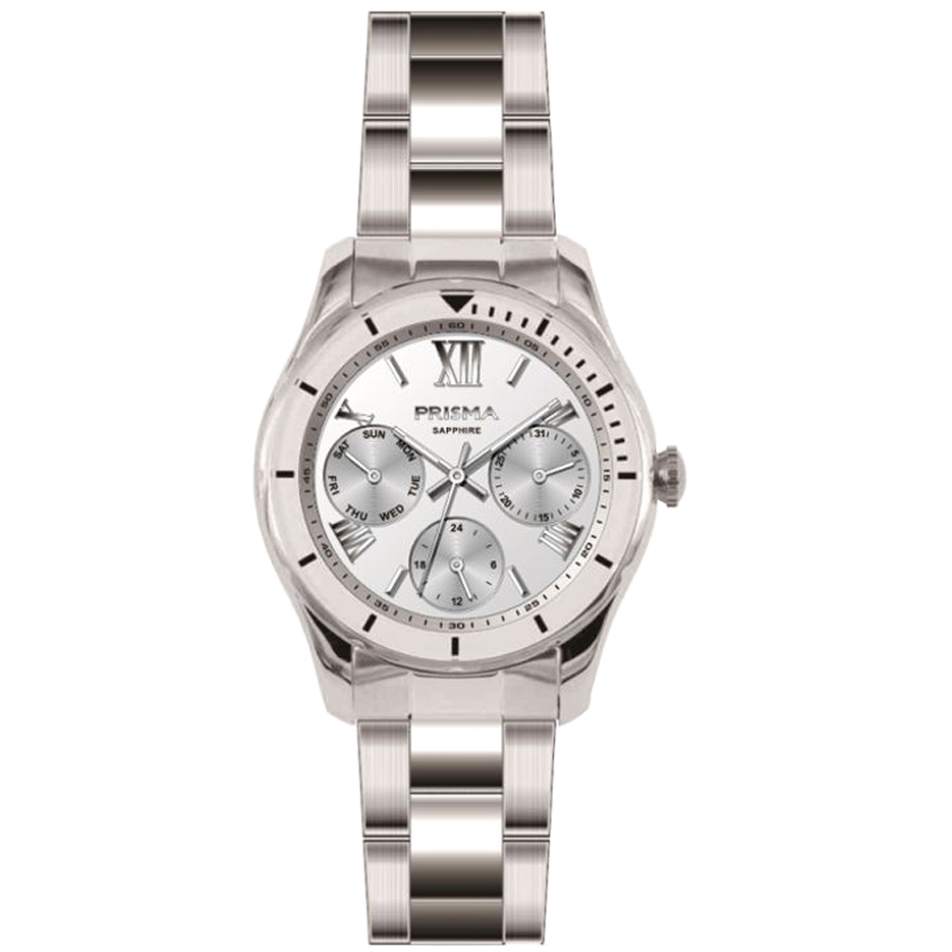Het sportieve maar toch elegante Prisma dameshorloge met referentie P.1889 heeft een wijzerplaat met een tal van functies. Zo heeft het horloge twee subwijzerplaten waar je de dag en datum op kunt aflezen. Daarnaast is er een subwijzerplaat met een 24-uurs aanduiding. Het horloge beschikt over een SeikoVX3J Quartz-uurwerk