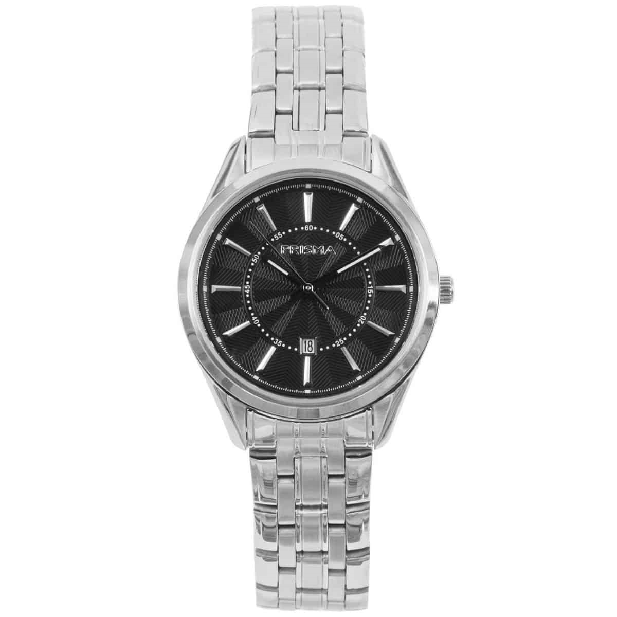 Het Prisma dameshorloge met referentie P.1705 beschikt over een zwarte wijzerplaat met een aangebrachte structuur. Boven de zes-uurmarkering is de datum af te lezen.