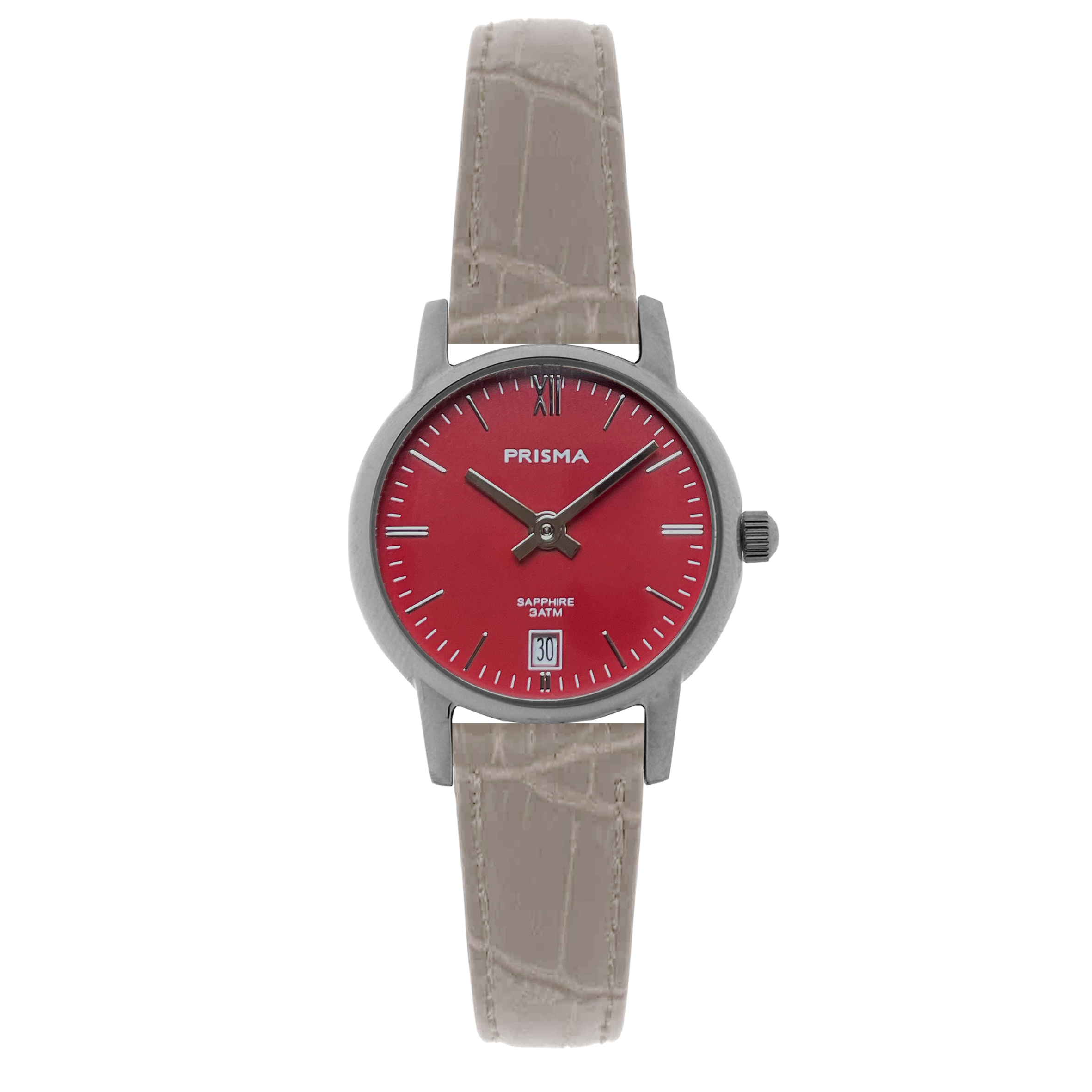 Klassiek dameshorloge van het Nederlandse merk Prisma met rode wijzerplaat en grijskleurige lederen band.