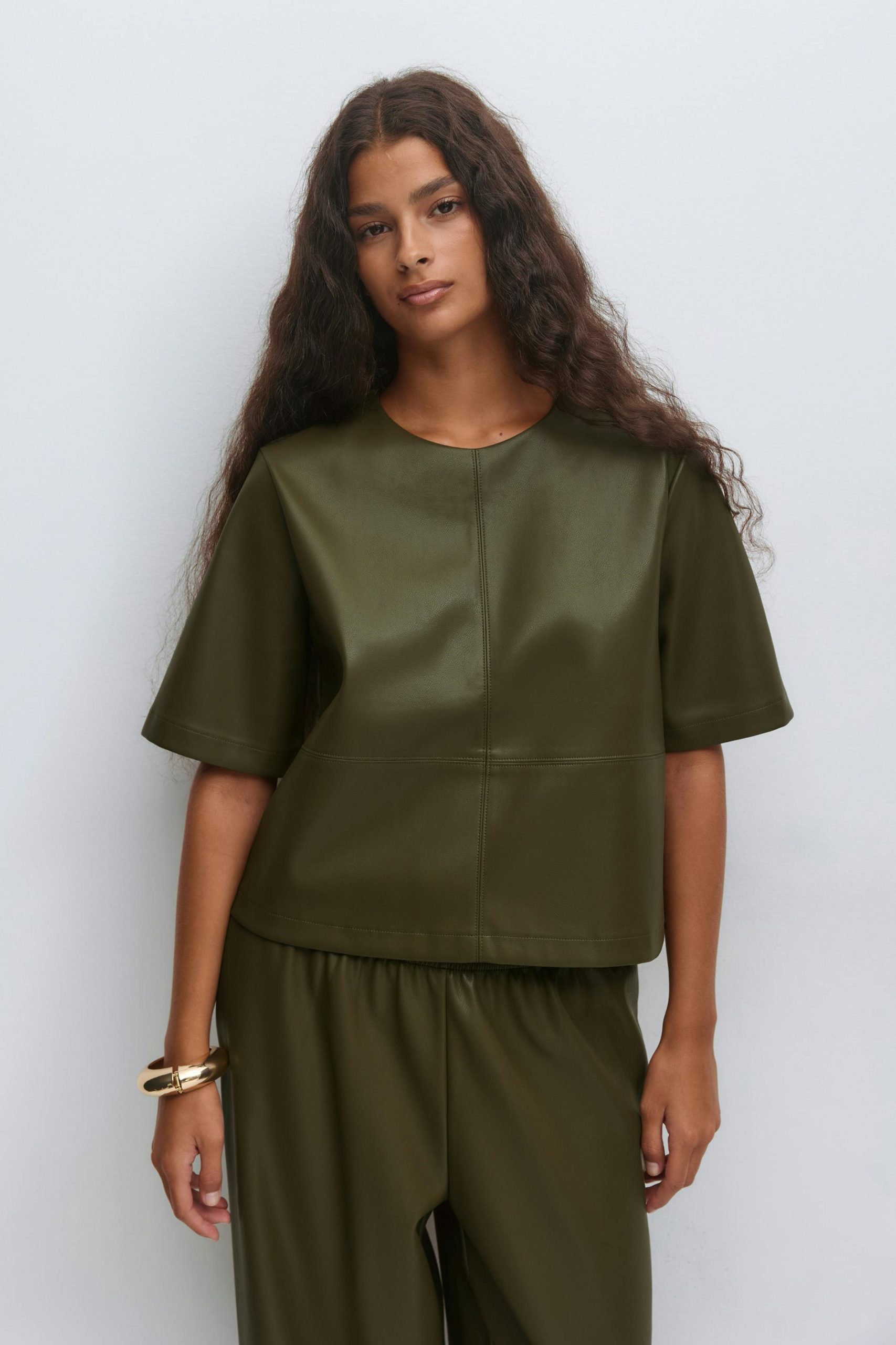 Boxy t-shirt van imitatieleer met korte mouwen. Het t-shirt is groen en heeft ruimvallende stijl. Het heeft ronde halslijn en decoratieve zoom details aan de voor- en achterzijde.