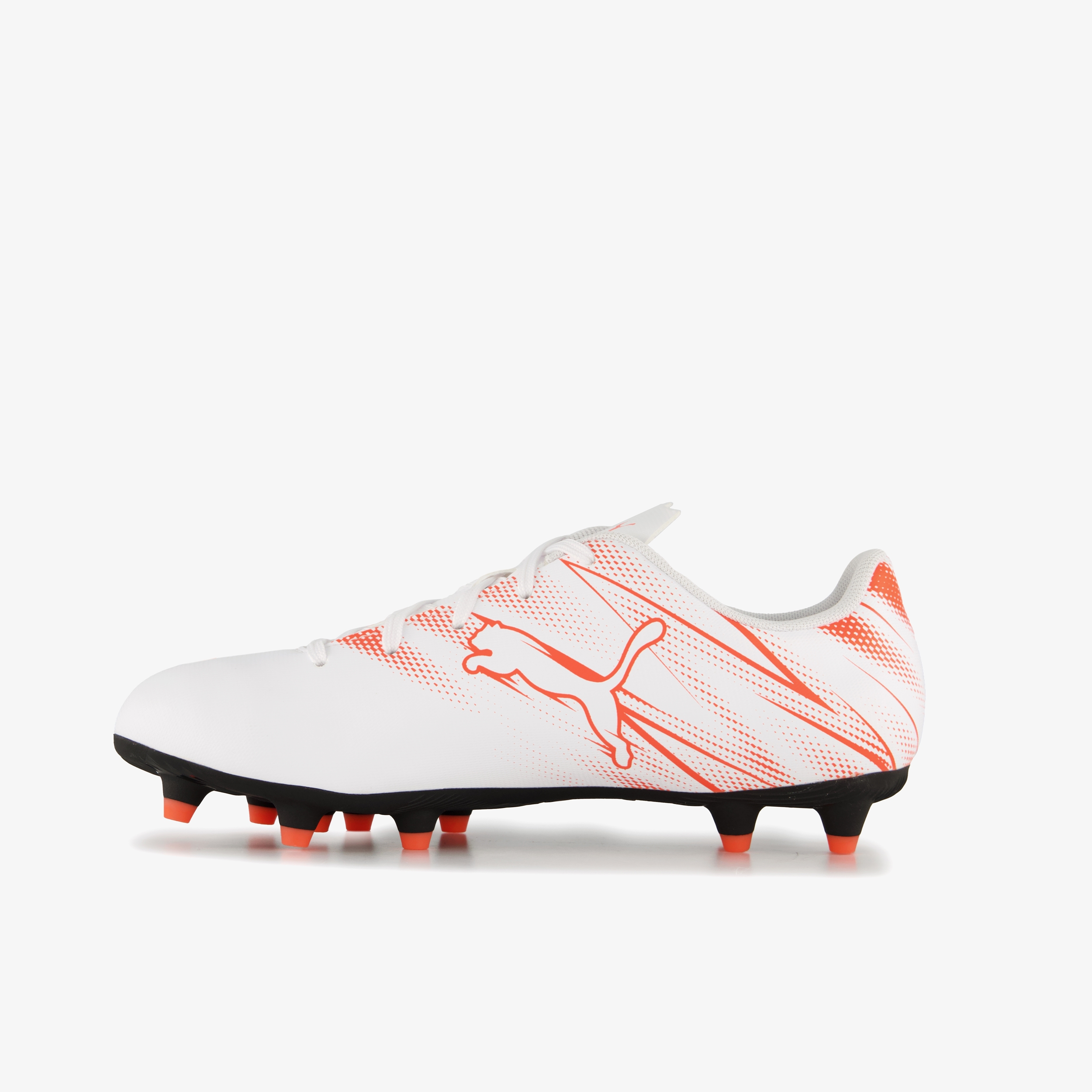 Witte Puma Attacanto FG voetbalschoenen voor kinderen. Het buitenwerk is gemaakt van imitatieleer, het binnenwerk van textiel en de lichte buitenzool is van rubber. Voorzien van een vetersluiting en een comfortabele binnenzool van textiel. Deze is uitneembaar. De FG (Firm Ground) noppenconstructie is geschikt voor (droog)natuurgras. Het buitenwerk wordt versierd met een rode print en merkopdrukken.