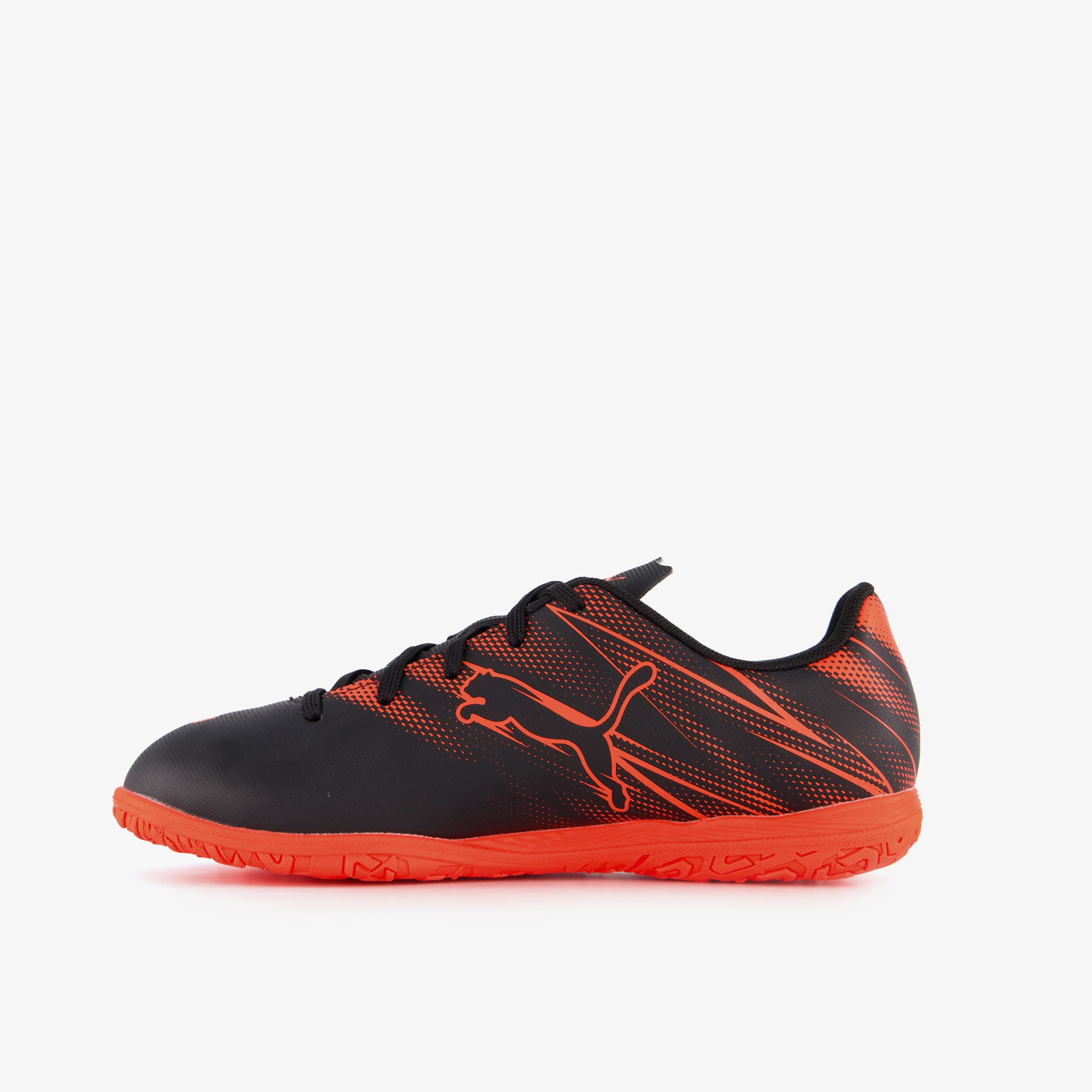 Zwarte Puma Attacanto IT zaalschoenen voor kinderen. Het buitenwerk is gemaakt van imitatieleer, het binnenwerk van textiel en de non-marking profielzool is van rubber. Voorzien van een vetersluiting en een comfortabele binnenzool van textiel. Deze is uitneembaar. De Puma Attacanto IT zaalschoenen hebben een lichte, flexibele buitenzool. Het buitenwerk wordt versierd met rode details en merkopdrukken.