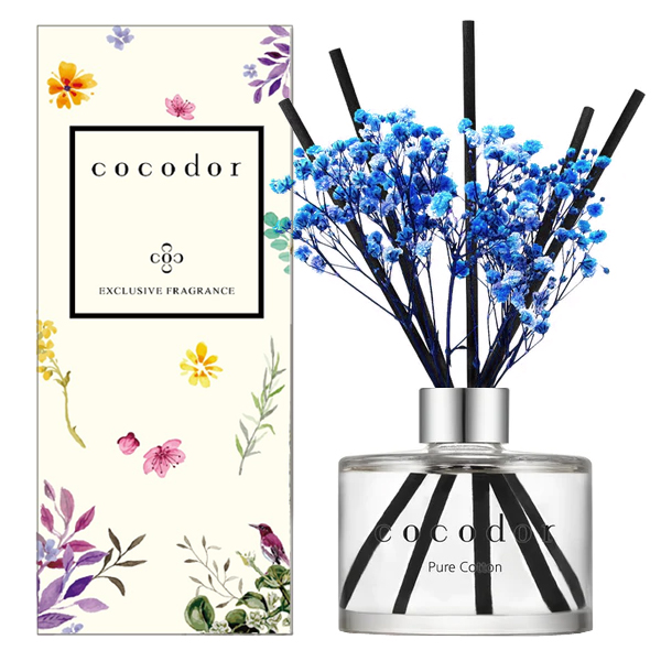Parfumdiffuser van 200 ml met zwarte stokjes en gedroogde blauwe bloemen. De elegante en verfijnde geur van Pure Cotton is ideaal voor thuis, op kantoor en in alle ontvangstruimtes. Citrus en munt, toegevoegd aan de geur van schone was, vormt een frisse katoengeur. Een geur die een schoon en puur gevoel geeft, zoals pas gewassen linnen.