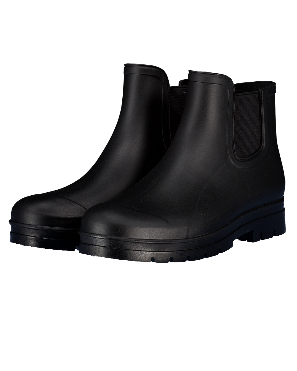 Deze zwarte dames regenlaarzen hebben een enkelhoog model met elastische zijkanten, waardoor je ze makkelijk aantrekt en ze prettig om je enkel aansluiten. De stevige zool geeft grip tijdens nat weer. Dankzij het ontwerp van regenlaarzen blijven je voeten droog wanneer je door regen of plassen loopt. Een praktische keuze voor wisselvallige dagen.