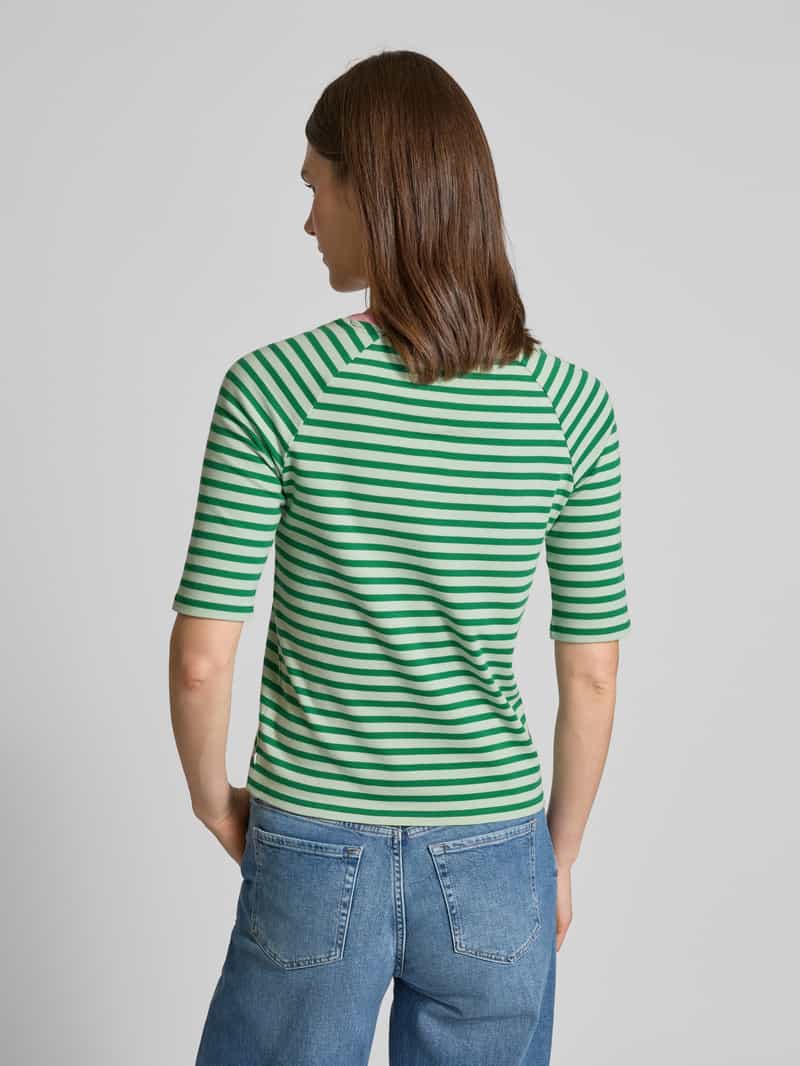 T-shirt voor dames van Tom Tailor Denim;Look: Two-tone;Pasvorm: Regular fit ;Motief: gestreept;Details: Contrastkleur bij de kraag;Hals: ronde hals;Mouwvorm: Raglanmouwen met korte mouwen;Materiaalverwerking: Jersey;Materiaal: puur katoen;Ruglengte bij maat S: 57 cm;Borstomvang bij maat S: 41 cm