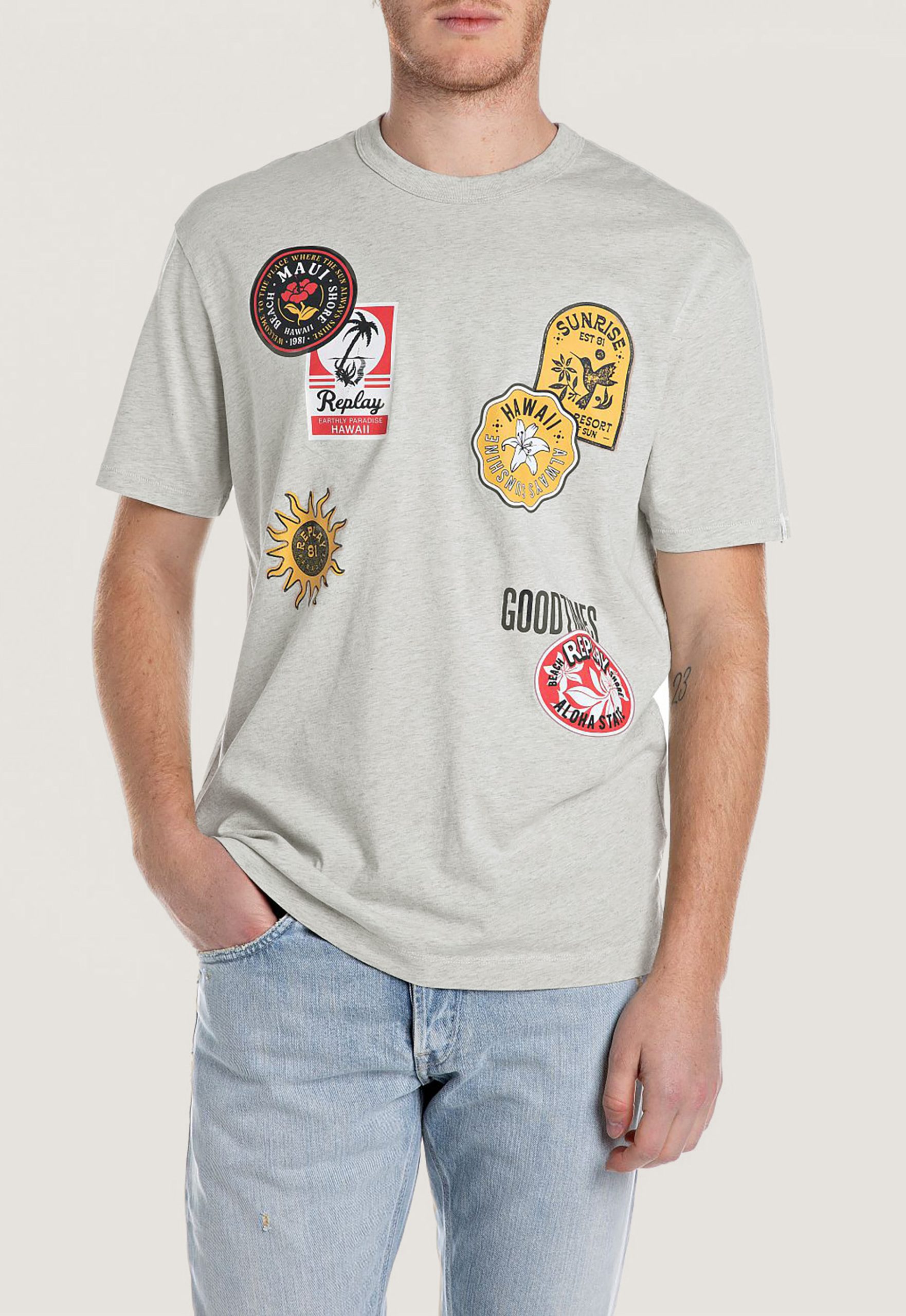 Dit is het M3040.23814N Aop Patch T-Shirt van het merk Replay. Een grijs gemêleerd T-shirt met een ronde hals. Dit model heeft grafische afbeeldingen aan de voorkant.