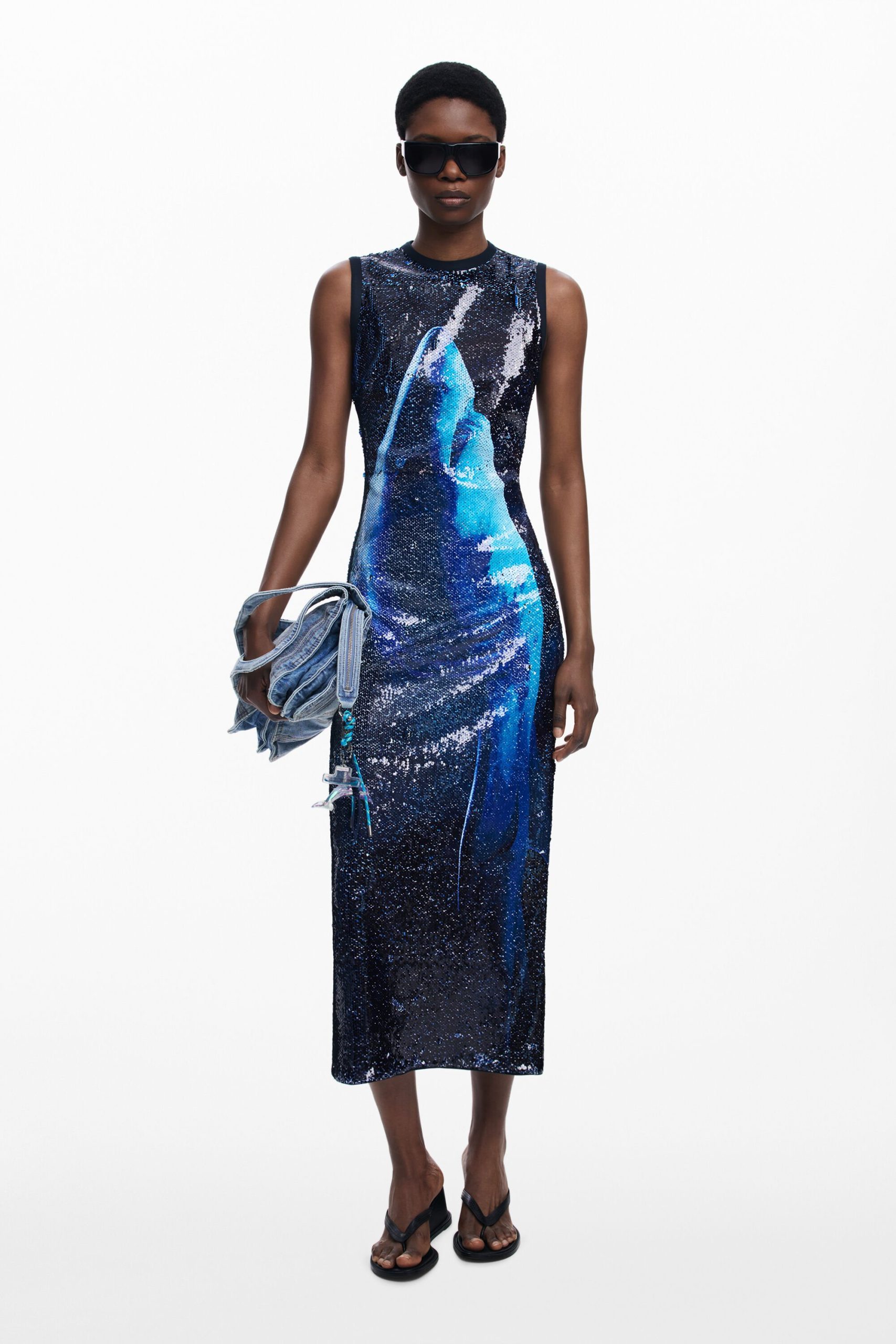 Lange mouwloze jurk met ronde hals, met applicatiedetails in omkeerbare pailletten die visuele variatie van het patroon mogelijk maken.