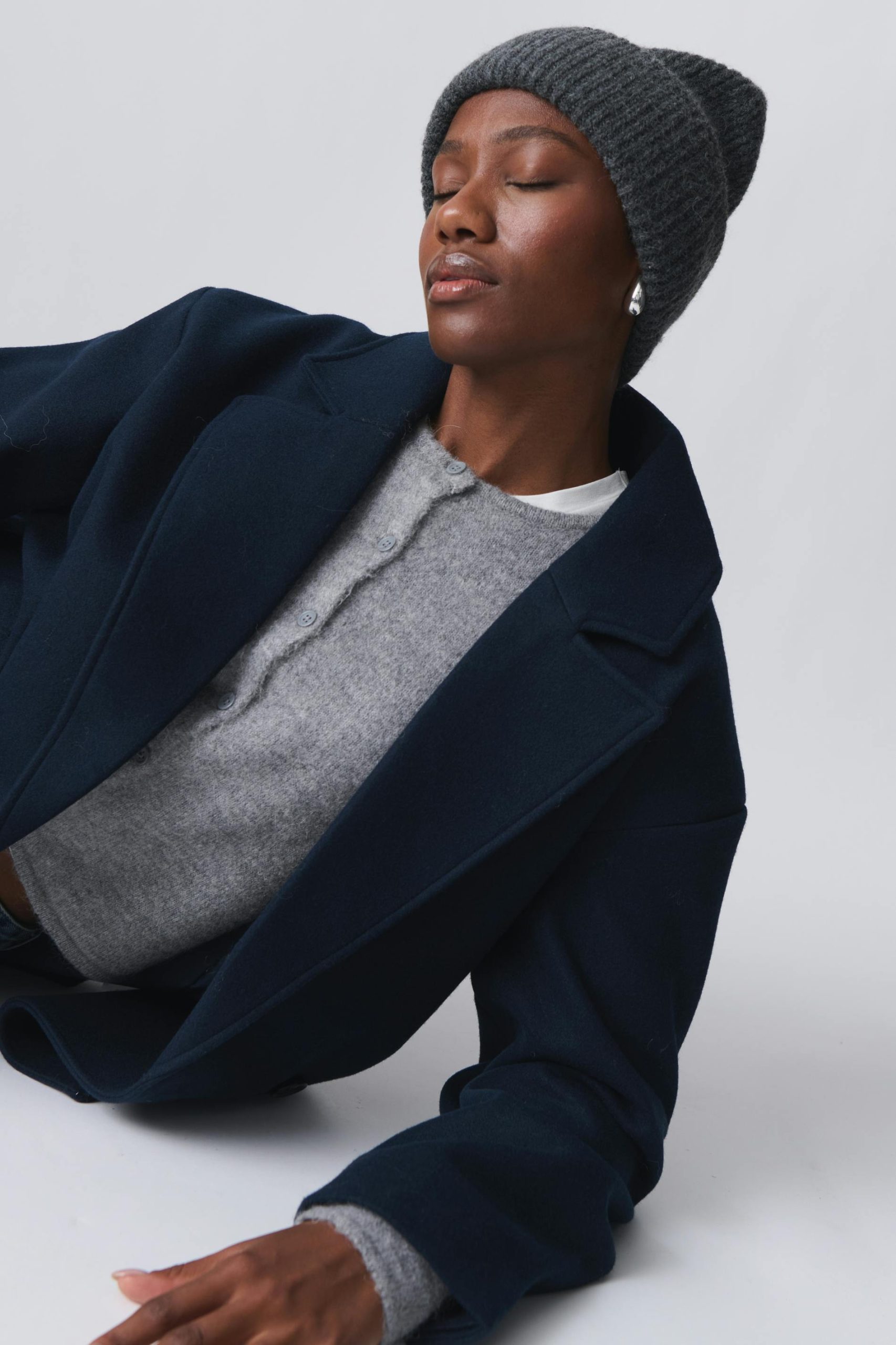 Ribgebreide muts met brede en opgevouwde zoom. De muts is grijs en heeft nauwsluitende pasvorm.