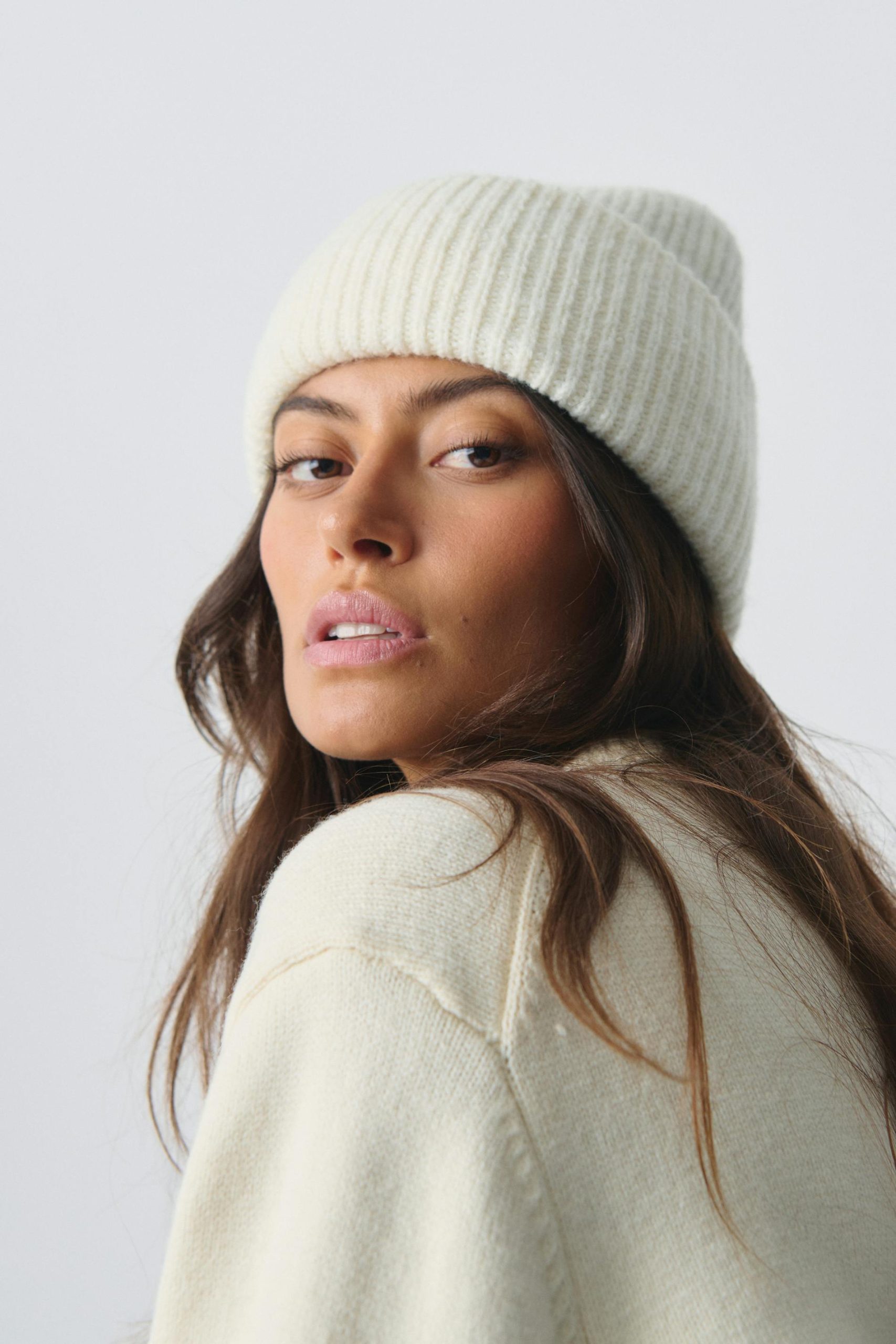Ribgebreide muts met brede en opgevouwde zoom. De muts is wit en heeft nauwsluitende pasvorm.