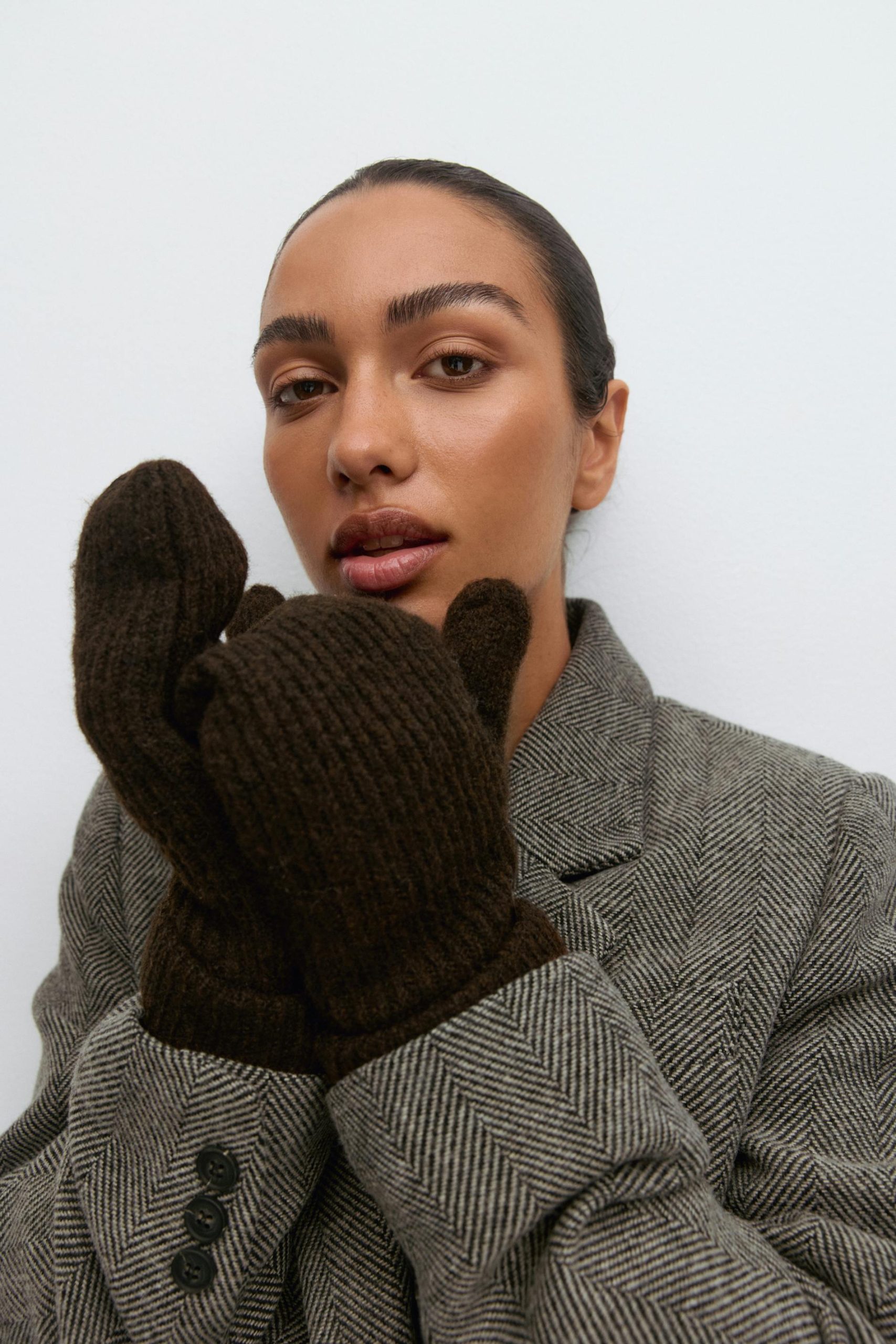 Gebreide handschoenen met opgevouwde manchet aan de pols. De wanten zijn bruin en hebben geribbelde kwaliteit.