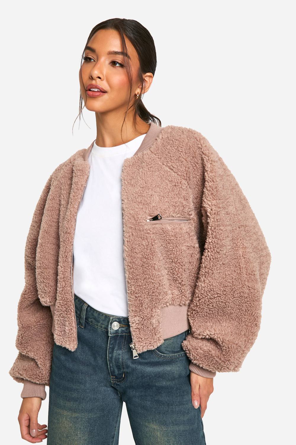 Rib Teddy Bomberjas – Gezellige borgstof voor ultiem comfort en warmte Geribbelde kraag, manchetten en zoom voor een nauwsluitende pasvorm Relaxte bomber-silhouet voor moeiteloze stijl Functionele ritssluiting aan de voorkant voor eenvoudig aan- en uitkleden Veelzijdige, cropped lengte die perfect is om overheen te dragen Omarm het gure seizoen met deze onweerstaanbaar zachte teddy bomberjas. De luxueuze borgstof geeft een weelderig gevoel en houdt je lekker warm tijdens informele uitstapjes. Dankzij de ontspannen pasvorm en cropped lengte is hij ideaal om over je favoriete truien of T-shirts te dragen. Combineer hem met een high-waisted jeans en sneakers voor een relaxte weekendlook, of draag hem over een midi-jurk en enkellaarsjes voor een trendy brunchoutfit. De geribbelde details zorgen voor een comfortabele pasvorm, terwijl de ritssluiting aan de voorkant eenvoudig stylen mogelijk maakt. Of je nu op weg bent naar een familiereünie of met vrienden koffie gaat drinken, deze jas wordt al snel je favoriete keuze voor moeiteloze kleding in koel weer. De veelzijdigheid maakt hem een onmisbare toevoeging aan elke modebewuste garderobe, perfect voor wie on-trend wil blijven zonder in te leveren op comfort.