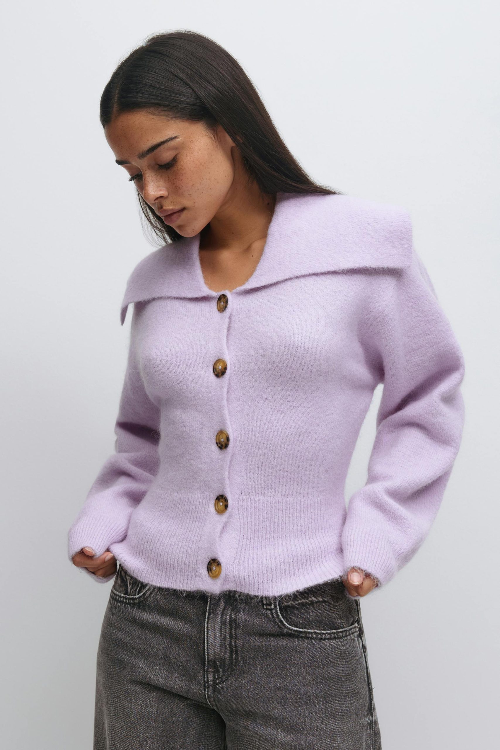 Gebreide cardigan met grote kraag. De cardigan is paars en heeft geribbeld detail aan de taille en aan de uiteinden van de mouwen. Het heeft overmaatse pasvorm, knoppen aan de voorkant, lange mouw en nauwsluitend taille.