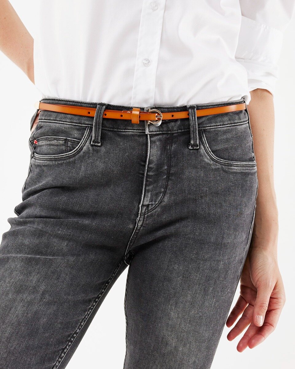 Een smal leren riempje is altijd handig om in de kast te hebben liggen. Je draagt ze subtiel in een jeans zodat je broek niet afzakt maar ook als accessoire is een riempje leuk. Draag hem bijvoorbeeld over een jurkje om je taille te accentueren of met een rokje als accessoire. De riem is er in het zwart en cognac.