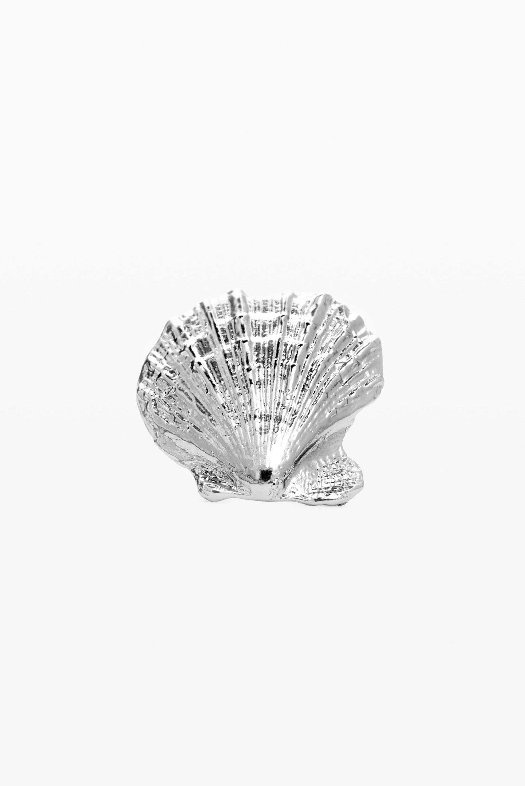 Ring in de vorm van een schelp, verzilverd met 1e wet zilver van 3 micro inch en druksluiting met pareldetail. Collectie Zalio x Desigual; ontworpen door Gala Meyer.