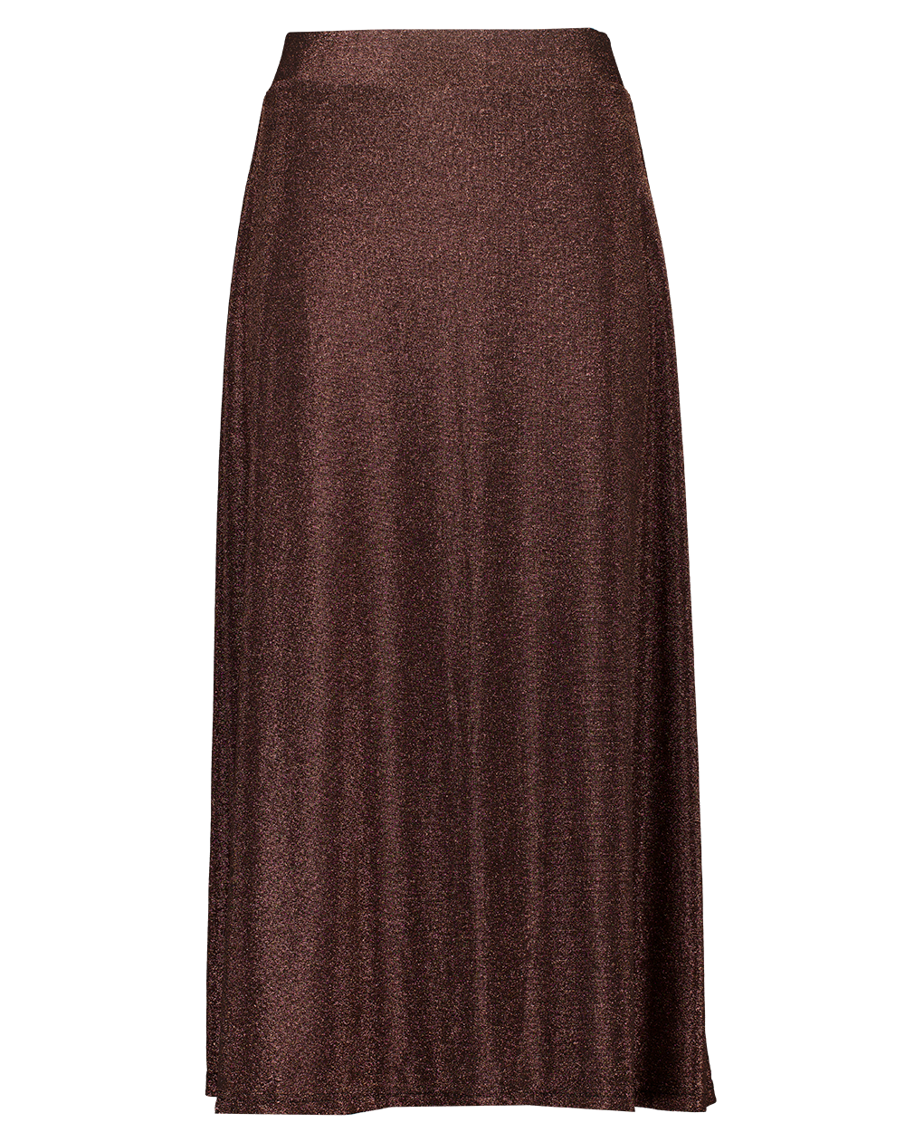 Deze lange rok voor dames is bruin van kleur en heeft een subtiele glans door het gebruik van metaaldraad in de stof. De rok is gemaakt van polyamide, metaaldraad en elastaan. Daardoor zit hij comfortabel en is hij licht rekbaar. Het eenvoudige ontwerp zonder knopen of zakken maakt deze rok makkelijk te combineren voor verschillende gelegenheden.