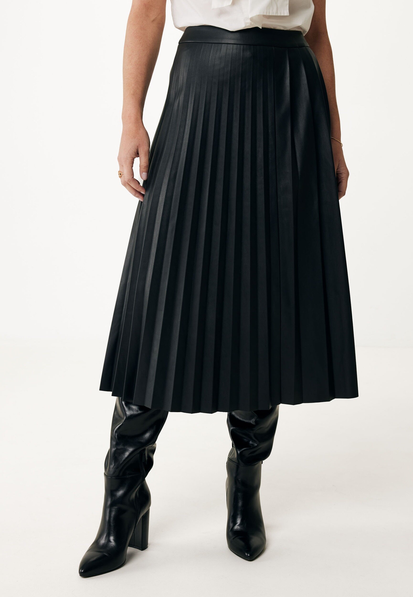 De geplooide zwarte rok van imitatieleer is een veelzijdig kledingstuk dat stijl en comfort combineert. Gemaakt van polyurethaan in een elegante zwarte tint, biedt deze rok een moderne uitstraling. De fijne plooien zorgen voor een vloeiende val en voegen een speels element toe aan je outfit.