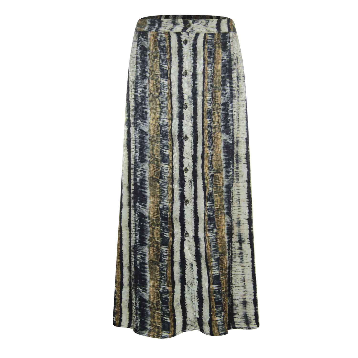 Rok in mooie gestreepte stof. Deze midi rok heeft een knoopsluiting met split aan de voorzijde en plooitjes aan tailleband.