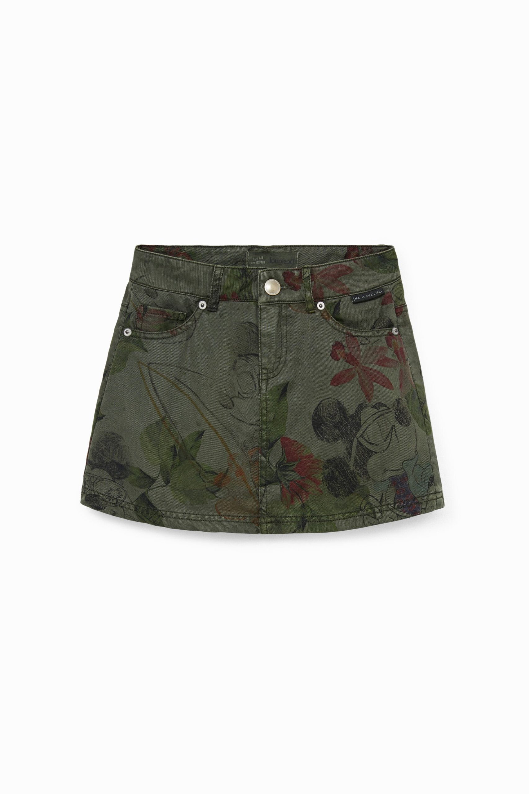 Mickey Mouse, het iconische Disney-personage, verschuilt zich in de bloemencamouflage van deze kaki rok van tencel. Zacht aanvoelend trapeziummodel met borduursels van Mickey Mouse en Minnie Mouse op de achterzak.