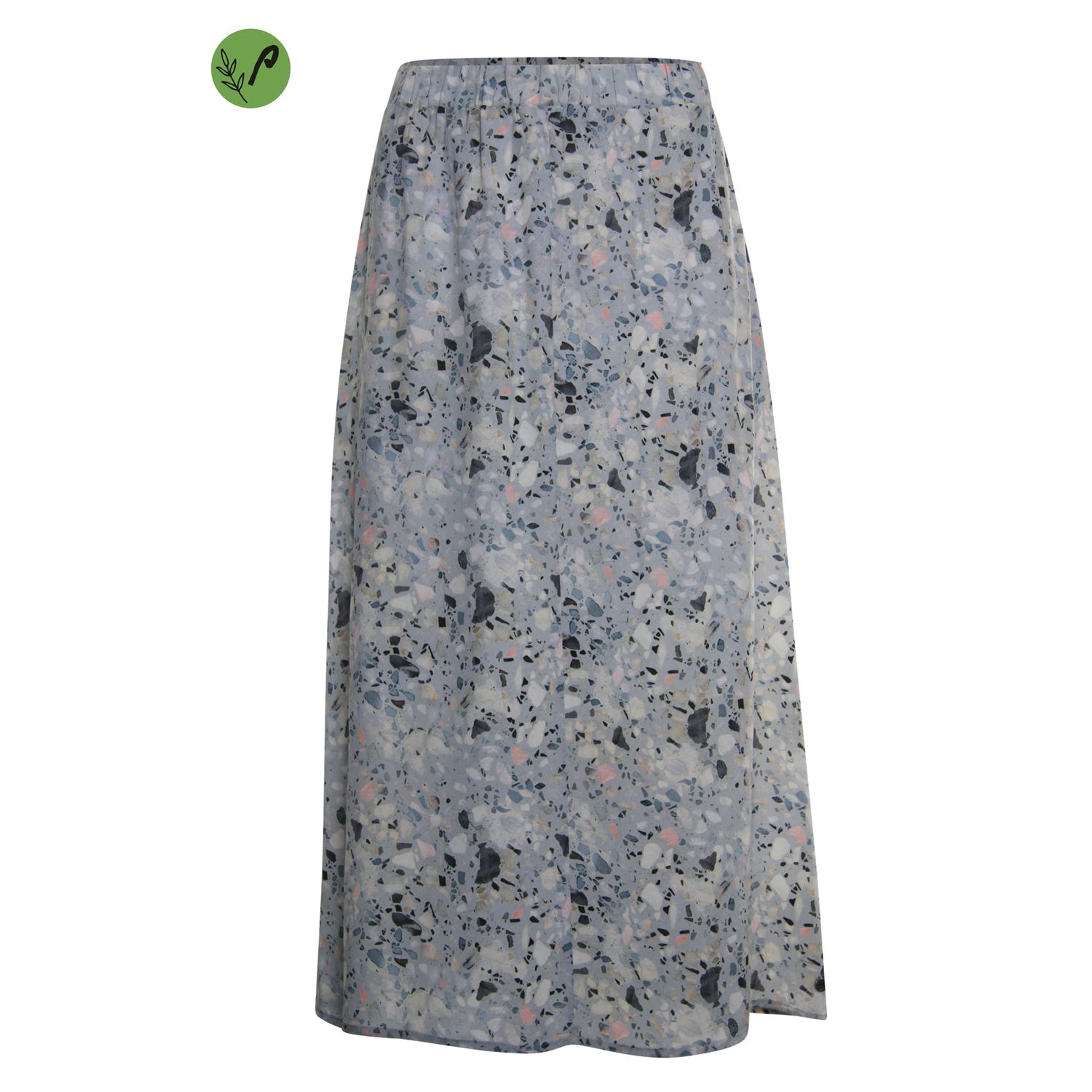 Geprinte rok in een mooie cupro / viscose kwaliteit. De rok is voorzien van steekzakken in de zijnaad en een elastische tailleband.