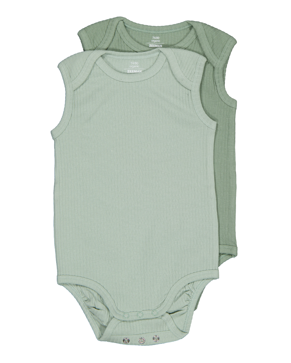 Deze romper in de kleur groen is gemaakt van katoen met een klein aandeel elastaan voor meer bewegingsvrijheid. De romper is geschikt voor baby's en heeft een sluiting onderaan voor het verschonen. Je ontvangt twee rompers in deze set.