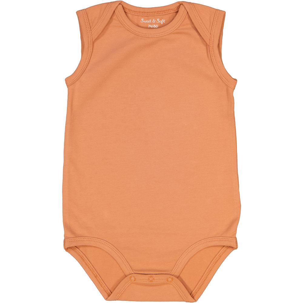 Dit oranje rompertje is gemaakt van katoen met een beetje elastaan, waardoor de stof zacht aanvoelt en licht meerekt. De mouwloze vorm geeft je voldoende bewegingsvrijheid, zodat je prettig kunt liggen en spelen. Onderaan zitten drukknoopjes die snel openen en sluiten, waardoor je het rompertje makkelijk aan- en uittrekt tijdens het verschonen.