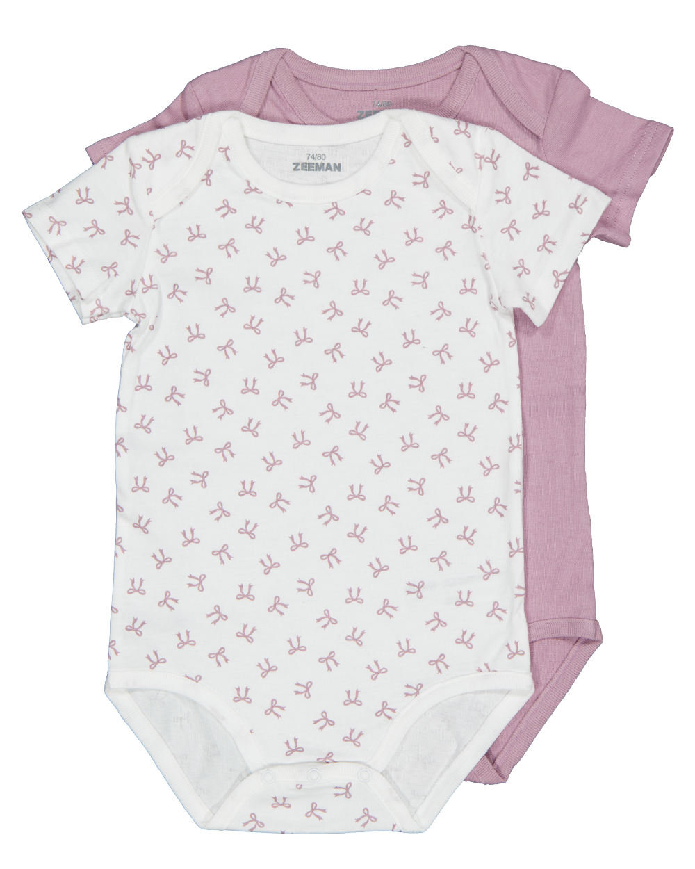 Set van twee babyrompers van 100% katoen. Eén romper is effen paars, de andere is wit met een subtiel paars dessin. De rompers hebben korte mouwen en een ronde hals. De praktische sluiting met drukknoopjes aan de onderkant zorgt ervoor dat je ze gemakkelijk aan- en uittrekt. Gemaakt voor dagelijks draagcomfort voor de allerkleinsten.
