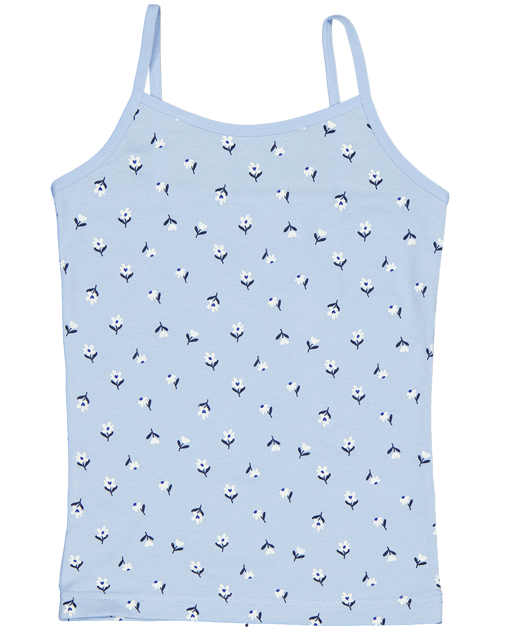Deze lichtblauwe singlet voor meisjes heeft een vrolijke bloemenprint. Gemaakt van katoen, polyester en elastaan, waardoor het hemdje soepel valt en licht rekbaar is. De smalle schouderbandjes zorgen dat het goed blijft zitten. Fijn voor warme dagen of als extra laagje onder een trui. Comfortabel voor dagelijks gebruik en makkelijk te combineren.