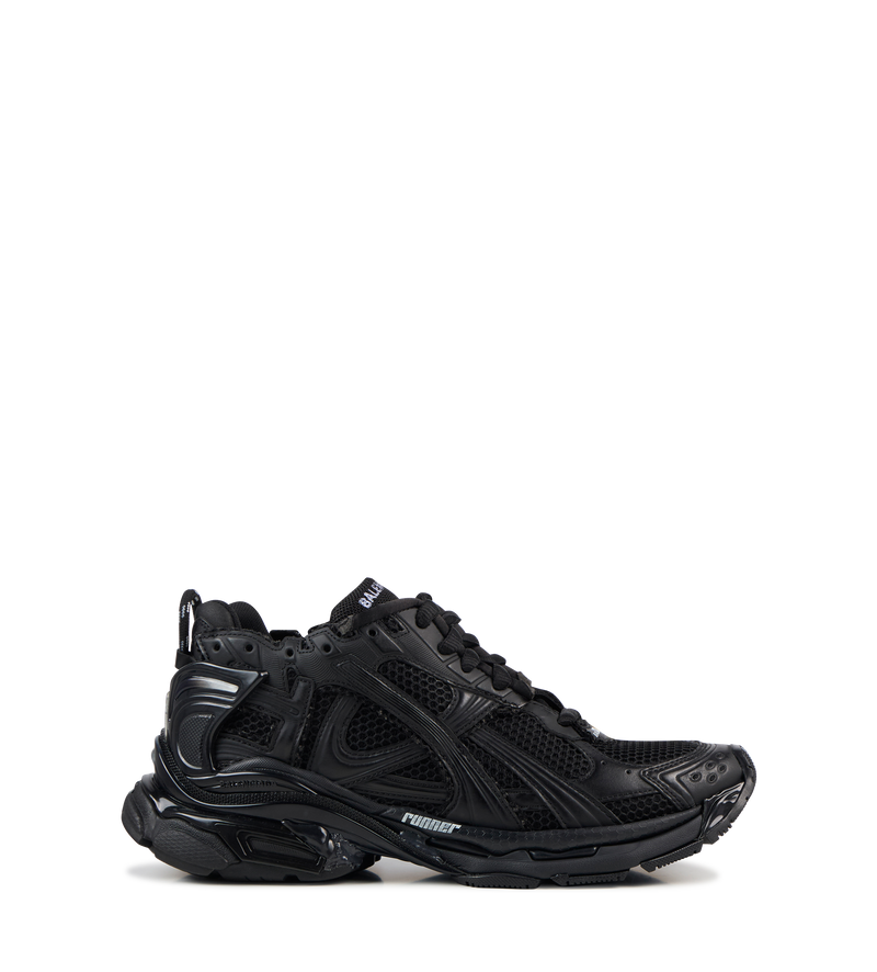 Runner Sneaker Black by Balenciaga Leather free Nylon and suede-like fabric Worn-out effect Printed size at the edge of the toe Embossed size at back Runner logo printed on exterior Balenciaga logo embroidered on the tongue Balenciaga logo at the back of the heel Back pull-on tab