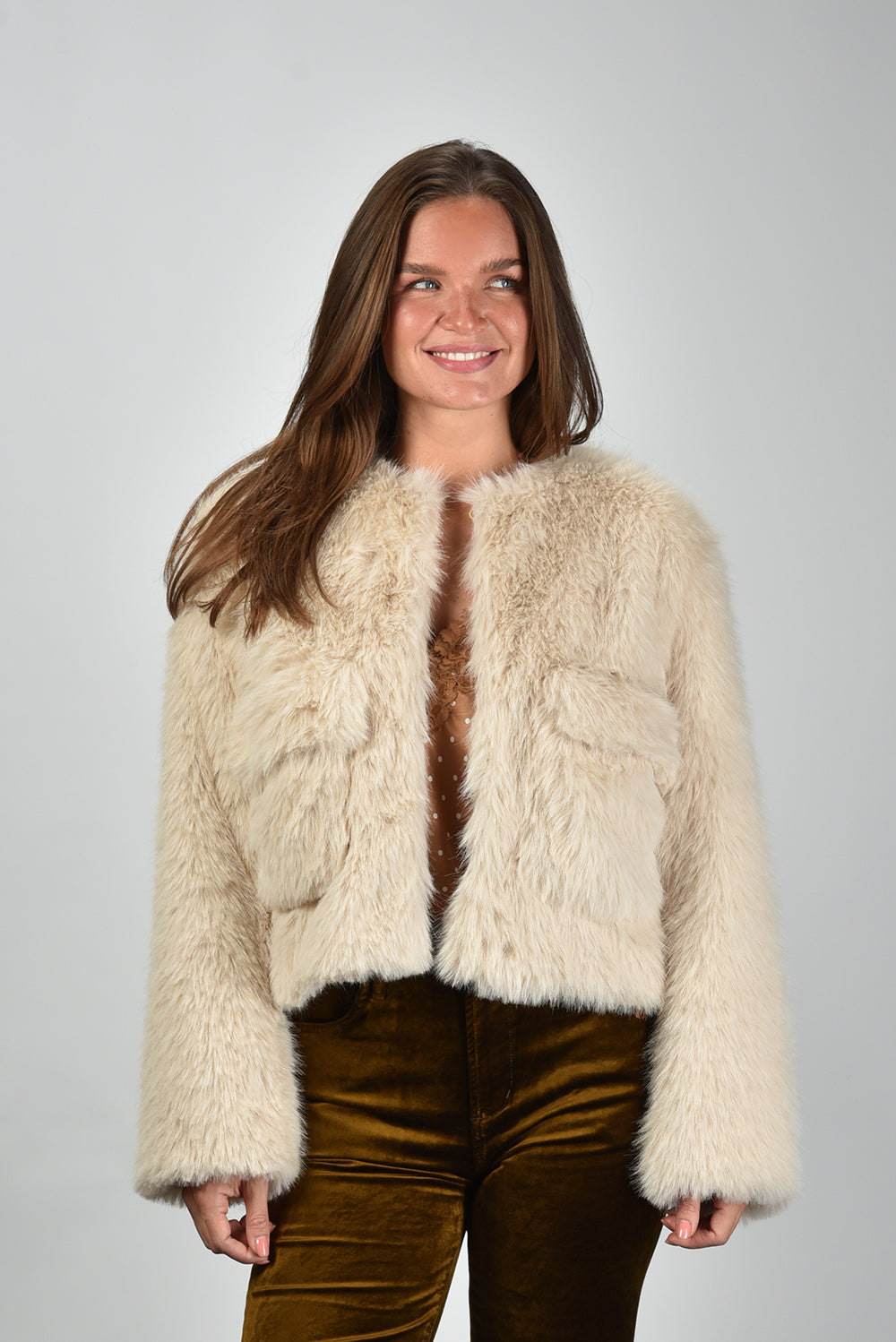 De faux fur jas Hannah Short van Sage & Ivy is bedekt met lang, lichtbeige imitatiebont dat direct opvalt door zijn volle structuur. Het korte, rechtvallende model eindigt net boven de heup en geeft elke outfit een moderne, nonchalante vorm. De twee opvallende klepzakken op de borst zorgen voor een stoer accent. Gemaakt van 100% polyester, waardoor de jas zijn vorm en zachte vacht mooi behoudt. Combineer de Hannah Short met de Citizens of Humanity broek Kimberly 70s Flare voor een elegante balans tussen retro en modern. Elk ontwerp van Sage & Ivy ontstaat in Nederland en wordt met aandacht geproduceerd in Europese ateliers, waar vakmanschap en verantwoordelijkheid centraal staan.