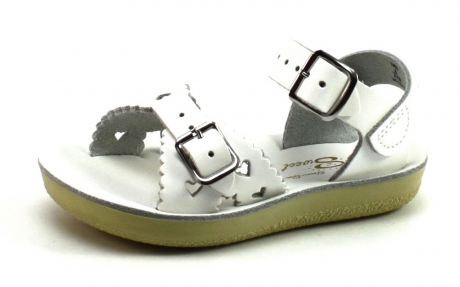 Witte sandaal artikel Sweetheart van het merk Salt Water Sandals. Salt water sandals zijn gemaakt van leer met een speciale coating. De sluiting is van roestvrijstaal en je kunt met deze sandaaltjes gewoon aanhouden als je de zee inloopt. De Salt Water Sandals zijn verkrijgbaar in verschillende modellen en kleuren. Ze kunnen nat en droog gedragen worden en kunnen gewassen worden op een ‘koud fijnwas-programma’ in de wasmachine!