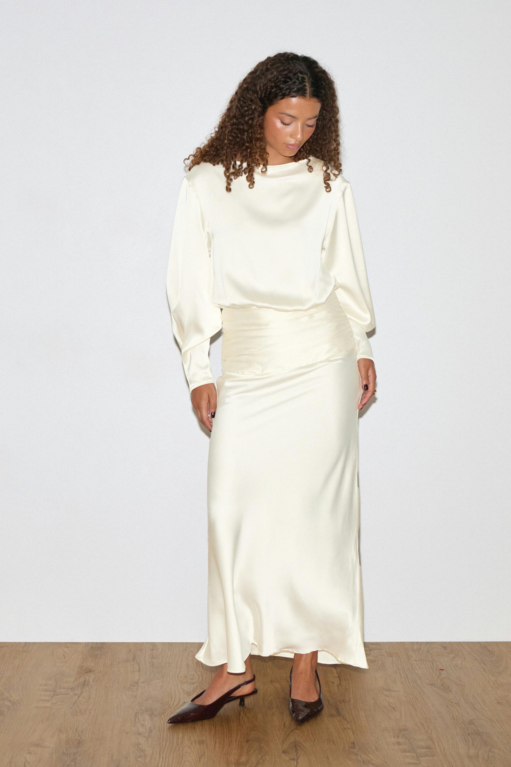 Maxijurk van satijn met een ballonmouw. De jurk is crèmekleurig en heeft een verzameld taille. Het heeft een ronde hals en een normale pasvorm.