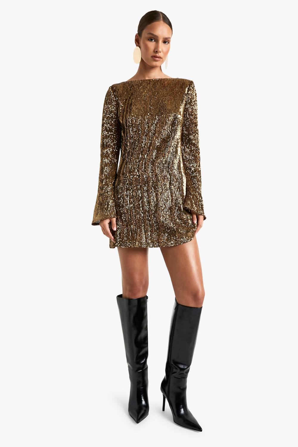 Schitterende all-over paillettenversiering Opvallend open rugontwerp met strikdetail Elegante ronde halslijn Opvallende belmouwen voor extra drama Mini lengte, perfect om je benen te etaleren Maak een onvergetelijke entree op je volgende feestelijke gelegenheid met deze betoverende paillettenminijurk. De all-over paillettenversiering vangt het licht op een schitterende manier, zodat je de hele avond straalt. Het open rugontwerp met verfijnd strikdetail voegt een vleugje allure toe, terwijl de opvallende belmouwen zorgen voor een dramatisch silhouet. Perfect voor kerstfeesten of oudejaarsavondbashes, deze jurk trekt gegarandeerd de aandacht. Combineer hem met bandige hakken en oversized hoop oorbellen voor een look die zowel glamoureus als modieus is. Voor een koelere avond kun je een bontimitatiejas over je schouders draperen voor een extra vleugje luxe. Dit veelzijdige stuk kan zowel feestelijk als casual gestyled worden, waardoor het een ideale keuze is voor diverse feestelijke gelegenheden gedurende het seizoen. boohoo Dames Scoop Back Mini Jurk met Uitlopende Mouwen | Gold | Maat: 40