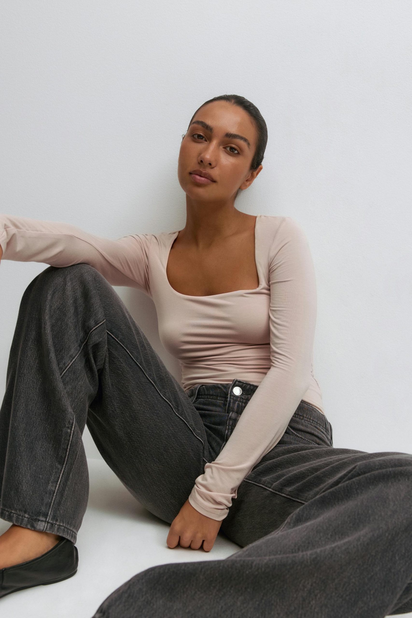 Geribbeld bovenstuk met lange mouwen met vierkante halslijn. Het topje heeft nauwsluitende pasvorm. Het heeft elastische kwaliteit en normale lengte.