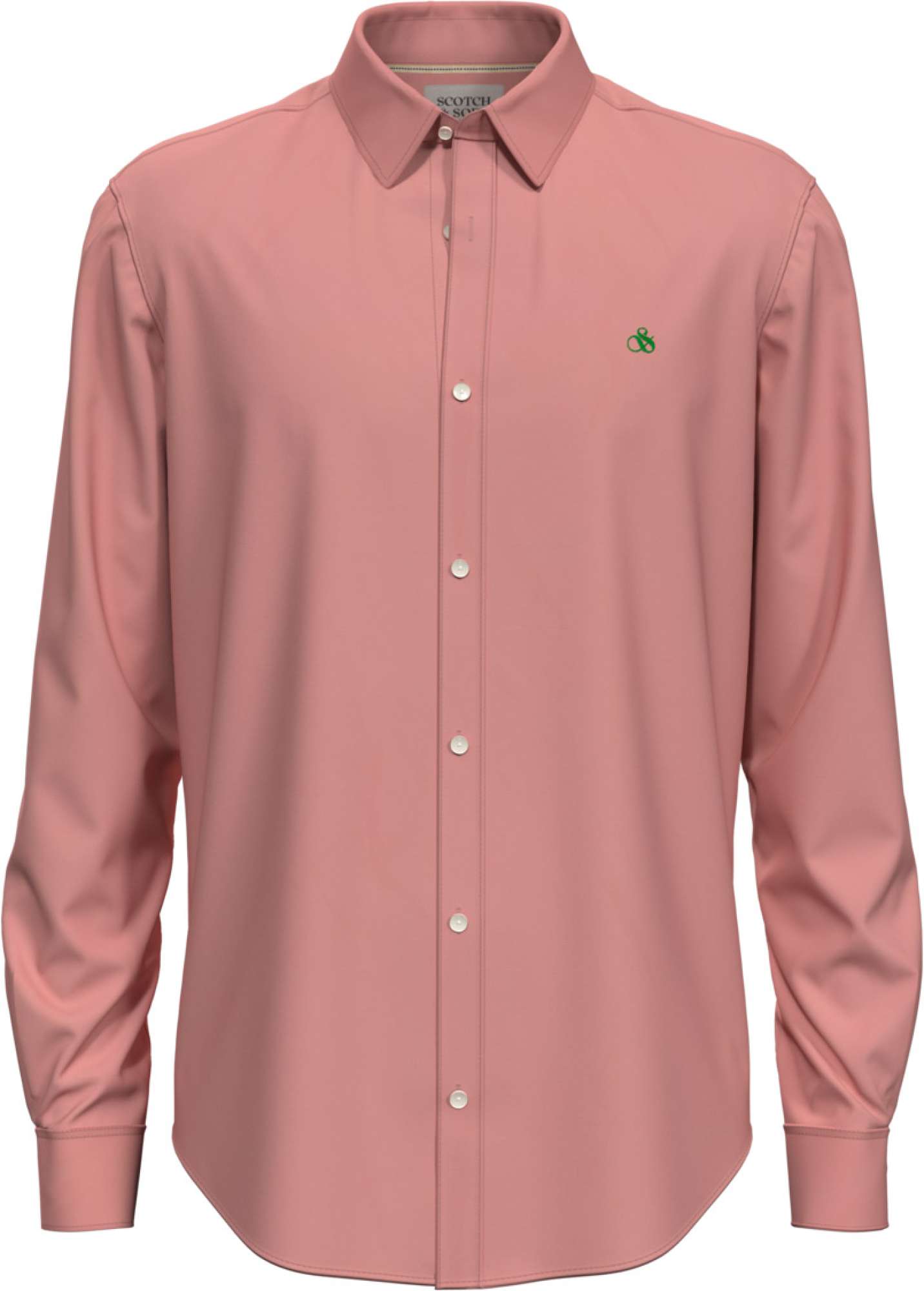 Scotch & Soda overhemd in niet al te felle Flamingo oranje kleur met klein geborduurde logo op borsthoogte. Fit, comfortabel aangesloten model gemaakt van stretchy poplin katoen. Valt normaal uit in de maat.