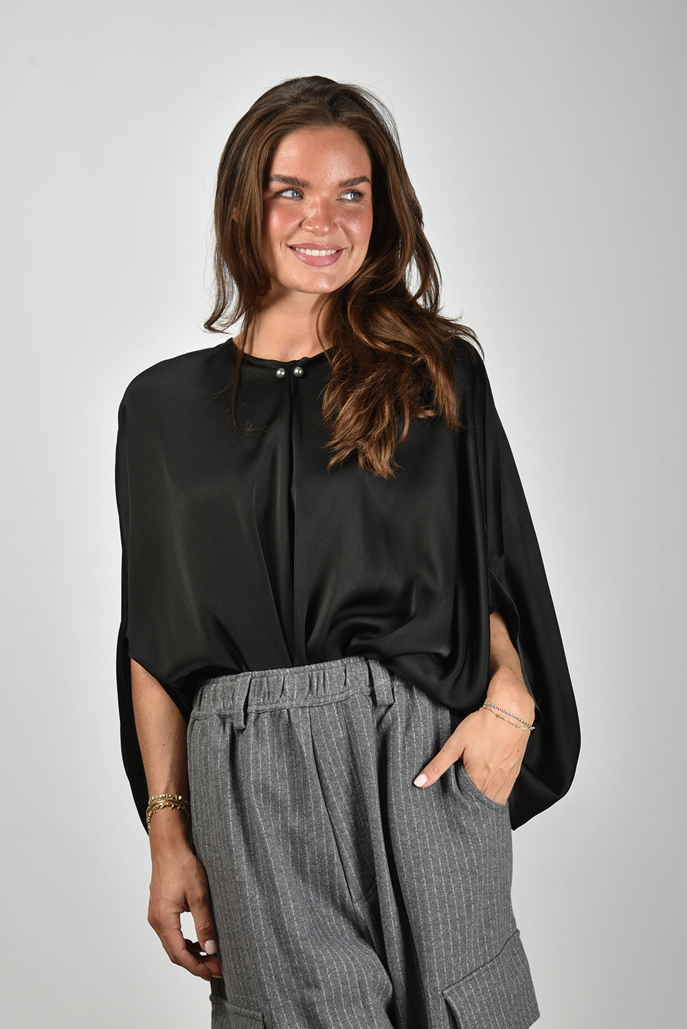 De blouse Hudson van Sea Me Happy valt meteen op door haar soepele vorm in satin black. De losse pasvorm en wijd uitlopende mouwen geven het ontwerp ruimte en lucht, terwijl de open zijkanten zacht meeveren bij elke stap. Aan de halslijn vallen twee parelachtige knopen op die het ontwerp een subtiel accent geven. De asymmetrische zoom zorgt voor een speelse lijn langs het lichaam, wat de blouse karakter geeft zonder dat het te veel wordt. Het materiaal van acryl en viscose voelt glad en licht aan, wat zorgt voor een mooie valling. Draag haar met de Sea Me Happy broek Romeo Baggy Flanel Cotton dark grey voor een ontspannen, elegante set met een artistieke twist van het Belgische label.