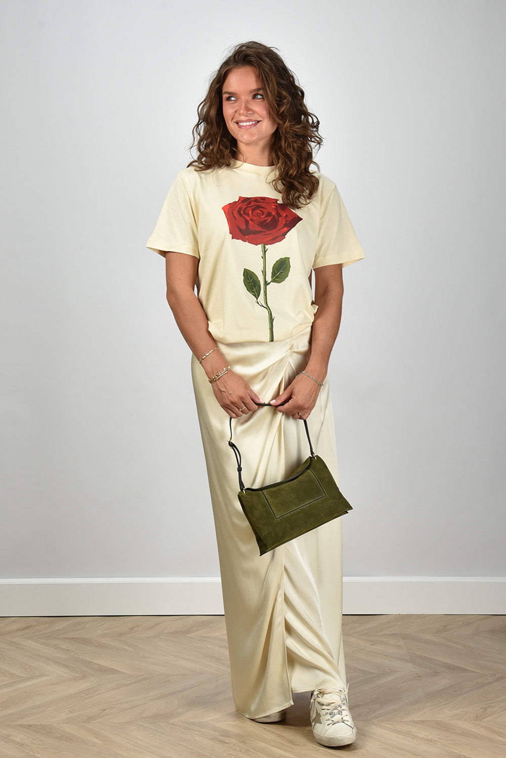 De rok Oki Satin van Sea Me Happy valt op door zijn lange, rechte snit en zachte glans. Door het soepelvallende satijn vangt hij mooi het licht, waardoor de beige tint, ook wel cocktail foam genoemd, extra diepte krijgt. Aan de voorkant loopt een subtiele plooi die het silhouet wat speels maakt zonder de rustige lijn te verbreken. De rok is gemaakt van 100% polyester en valt normaal op maat. Draag hem met het Farm Rio T-shirt 341138 sand voor een gebalanceerde set waarin materiaal en vorm elkaar mooi aanvullen. Sea Me Happy staat bekend om ontwerpen met een ontspannen, artistieke stijl die met aandacht in België worden gemaakt.