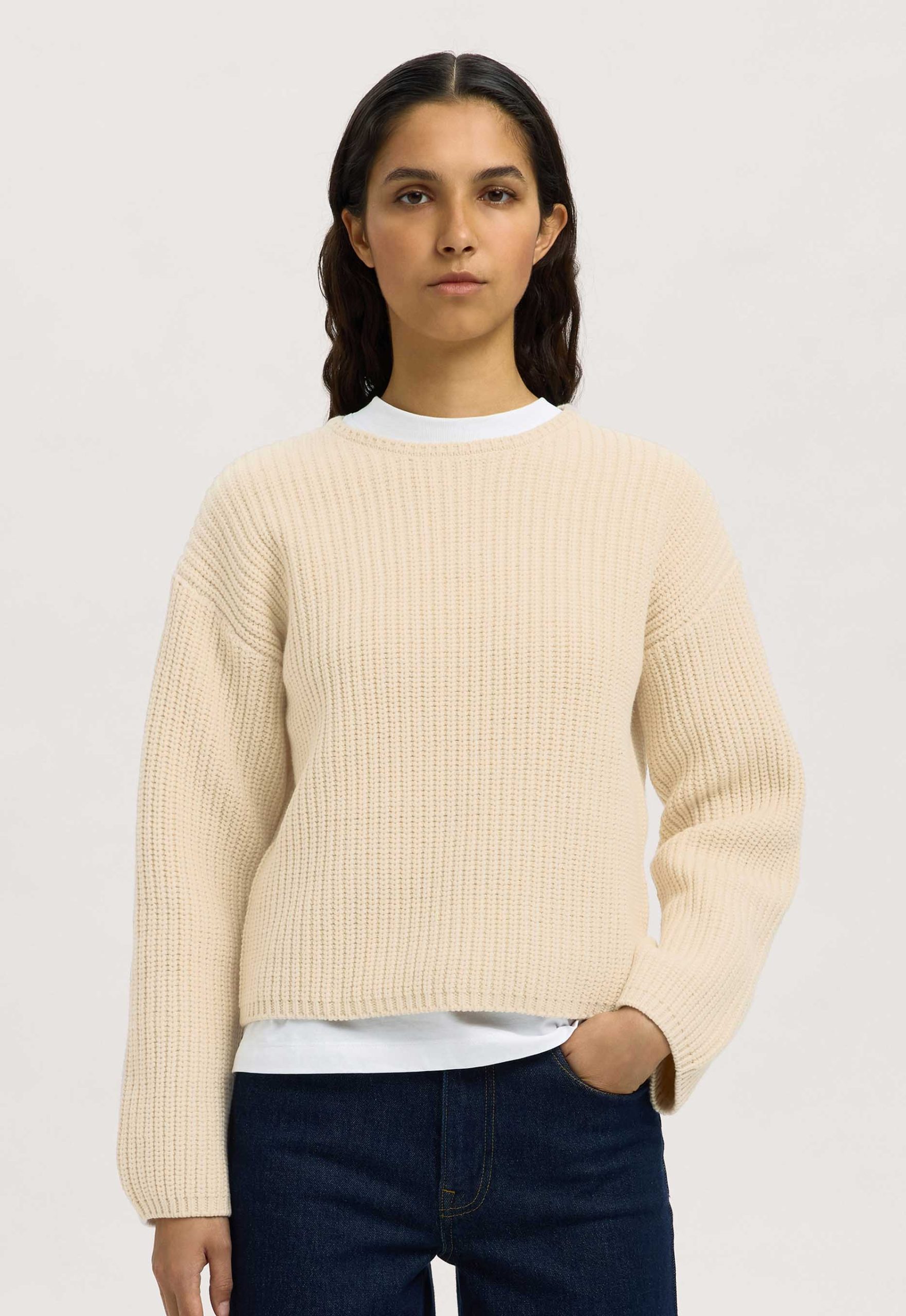 Dit is de Selma Trui van het merk Selected Femme. Deze gebreide trui heeft verlaagde schoudernaden en heeft een loose fit.