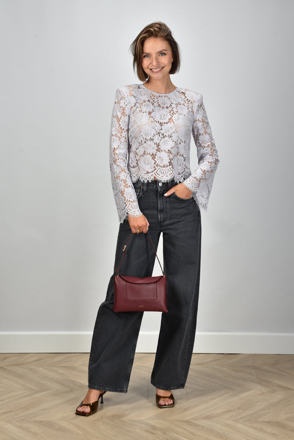 De top lilac van Self Portrait heeft een opvallend bloemenkantpatroon dat het ontwerp direct karakter geeft. De schouders zijn licht gestructureerd en hebben een subtiel puntig silhouet, wat zorgt voor een fraaie vorm. De mouwen en zoom zijn afgewerkt met een golvend kanten detail dat zacht over de huid valt. De stof voelt luchtig en stevig tegelijk door de mix van polyamide, katoen en viscose. Deze top valt normaal op maat en combineert de herkenbare signatuur van Self Portrait: vrouwelijk met een moderne twist. Mooi te dragen met de Wandler crossbody Penelope Slouch in acai crust voor een elegante citylook.