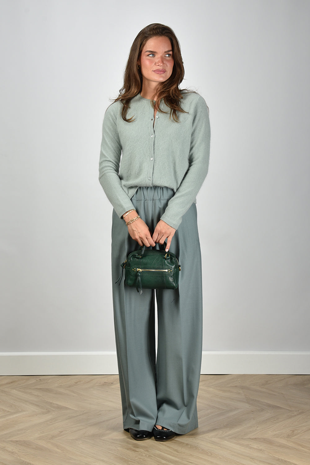 De wollen broek S5WI32 S69 0 van Semicouture heeft iets nonchalants en tegelijk een verzorgd karakter. De zachte grijsgroene tint, door het merk dew genoemd, laat de soepele wol mooi tot zijn recht komen. De wijde pijpen vallen ruim over de schoenen, wat het silhouet een ontspannen lengte geeft. De geplooide, elastische tailleband zorgt voor een pasvorm die prettig aansluit zonder te strak te zitten. Dankzij de 98% wol voelt de stof soepel en vol aan, met net genoeg elastane voor wat extra ruimte tijdens het dragen. Combineer deze broek met de Jerome Dreyfuss handtas Lucky Bowling Mini voor een rustige, stijlvolle citylook.