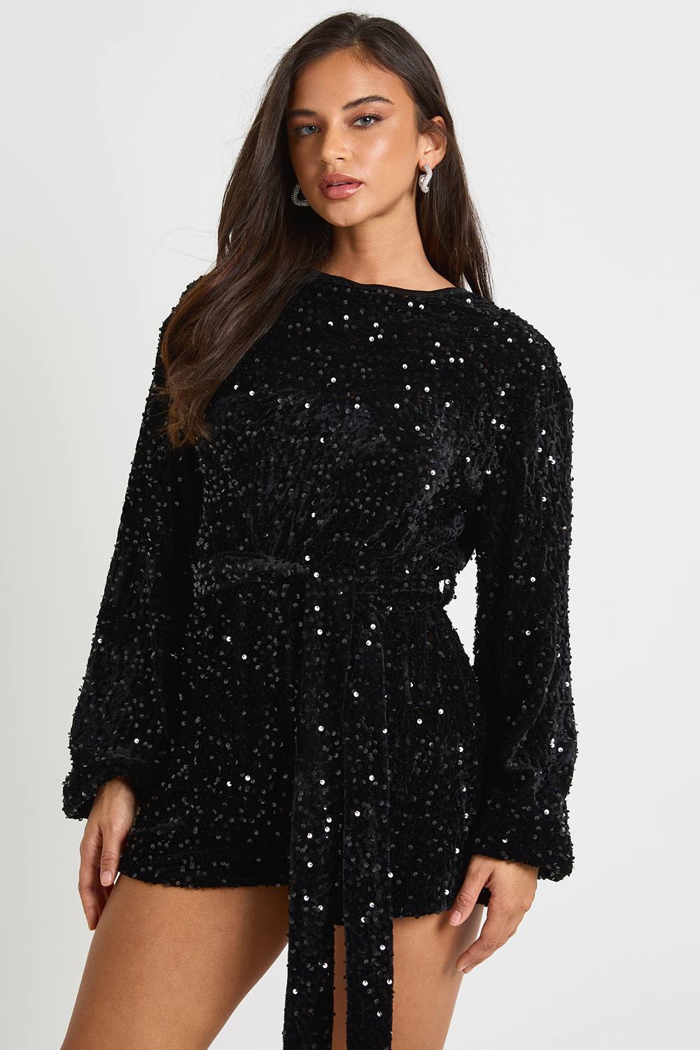Pailletten overal voor een verblindend effect Extreme ballonmouwen geven een dramatische uitstraling Met riem in de taille voor een flatterende silhouet Playsuit ontwerp combineert stijl en comfort Ronde halslijn voor een klassieke touch Maak een statement op je volgende feestelijke viering met deze opvallende pailletten playsuit. De extreme ballonmouwen creeren een gedurfde, modieuze look die perfect is voor wie graag opvalt. De met riem beklede taille accentueert je figuur, waardoor een flatterende vorm ontstaat die zowel comfortabel als stijlvol is. Ideaal voor kerstfeesten of oudejaarsavond borrels, deze playsuit straalt glamour en zelfvertrouwen uit. Combineer het met sandalen met bandjes en opvallende oorbellen voor een oogverblindende outfit. Voor een meer relaxte look, draag het samen met enkellaarsjes en een bontimitatie jas. De veelzijdigheid van dit stuk maakt het mogelijk om het zowel chic als casual te dragen, wat het tot een waardevolle aanvulling op je feestgarderobe maakt. Onthoud dat met pailletten helemaal doorlopend deze playsuit het enige statementstuk is dat je nodig hebt – laat het stralen en houd de accessoires minimaal voor maximaal effect. boohoo Dames Sequin Extreme Mouw Riem Playsuit | Black | Maat: 36