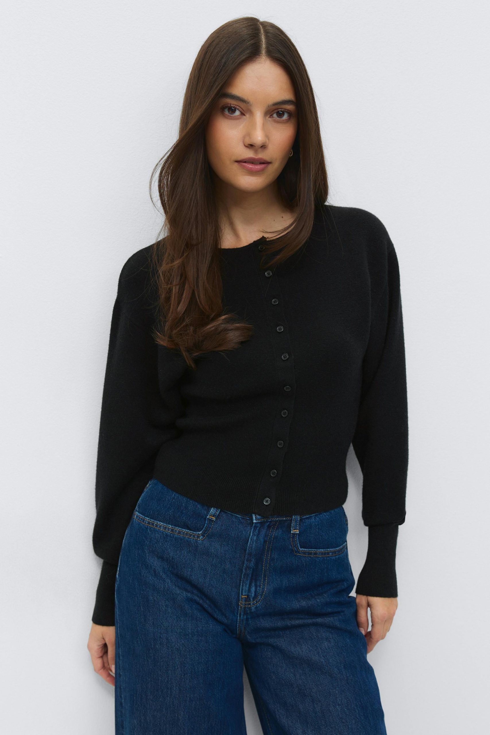 Getailleerd vest met toelopende taille. Het vest is zwart en heeft knoppen aan de voorkant. Het heeft lange mouwen, hangende schouders, wijd geribd gebreid materiaal aan de mouwuiteinden en aan de onderkant, ronde halslijn en nauwsluitende pasvorm.