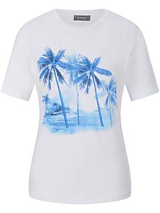 Shirt met ronde hals van MYBC. Met korte mouwen.Perfect bij jeans, shorts en witte broeken, met frontprint van palmmotieven in koele blauwtinten. 95% viscose, 5% elastaan. Lengte ca. 62 cm. Machinewasbaar. fijnwas tot 40°. chloorbleken niet mogelijk. koud strijken. chemische reiniging, veilig. drogen in de droger niet mogelijk. 36, 38, 40
