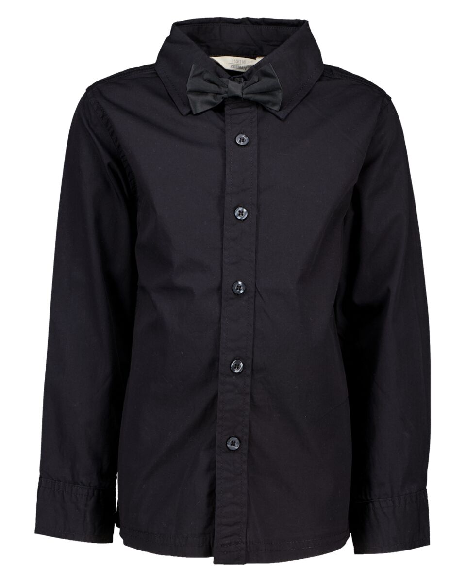 Dit zwarte jongensshirt heeft lange mouwen en een nette kraag met een strikje. Door de knoopsluiting aan de voorkant trek je het makkelijk aan en uit. De effen kleur geeft het shirt een rustige uitstraling, zodat je het goed kunt combineren met een nette broek of dragen bij een speciale gelegenheid.